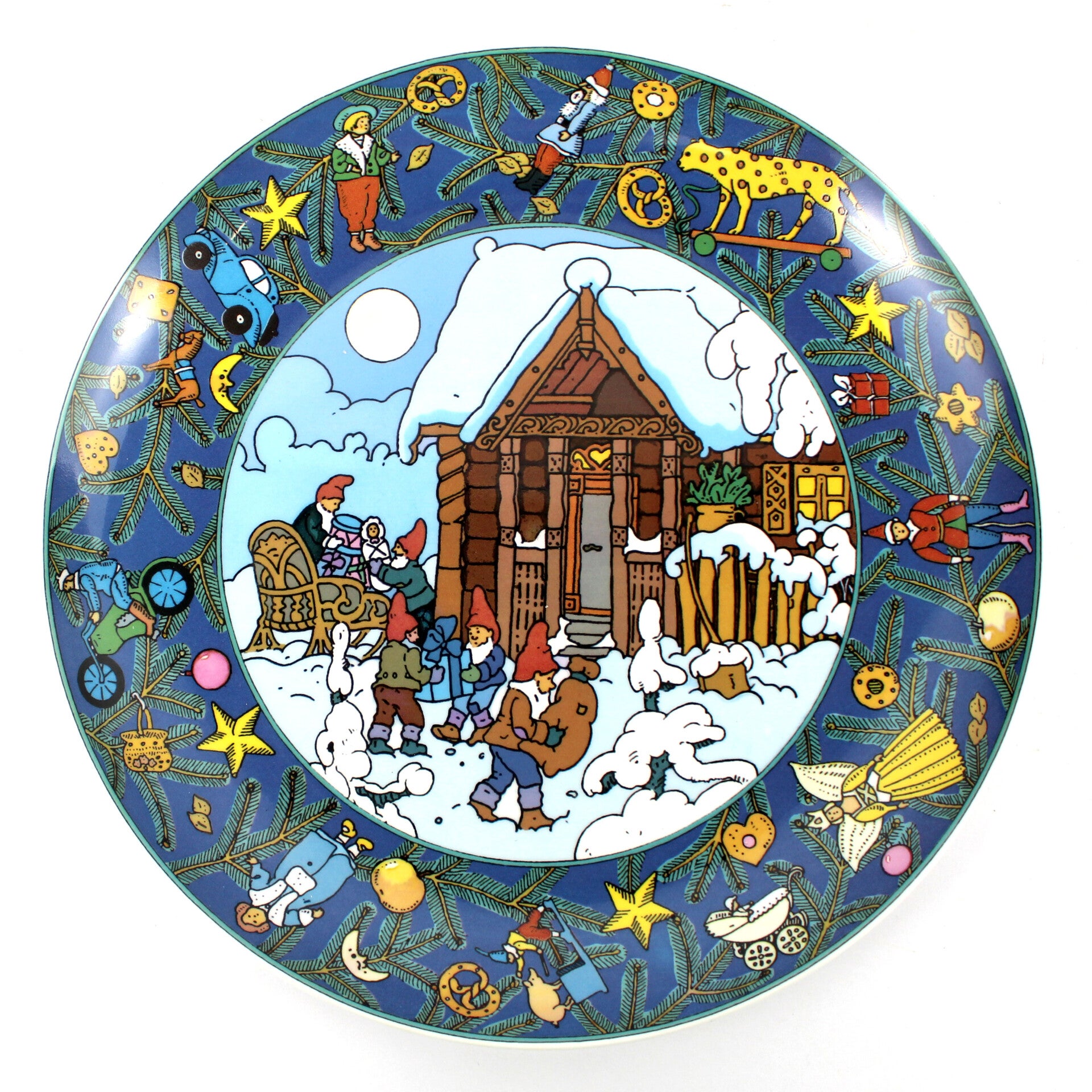 Prachtig groot decoratief kerstbord uit de serie Christmas in Europe van Villeroy & Boch, Duitsland. Dit bord draagt de titel “Scandinavië” en toont in het midden een charmante scène van elfen die de slee van de kerstman volladen met kado's met cadeautjes eronder.