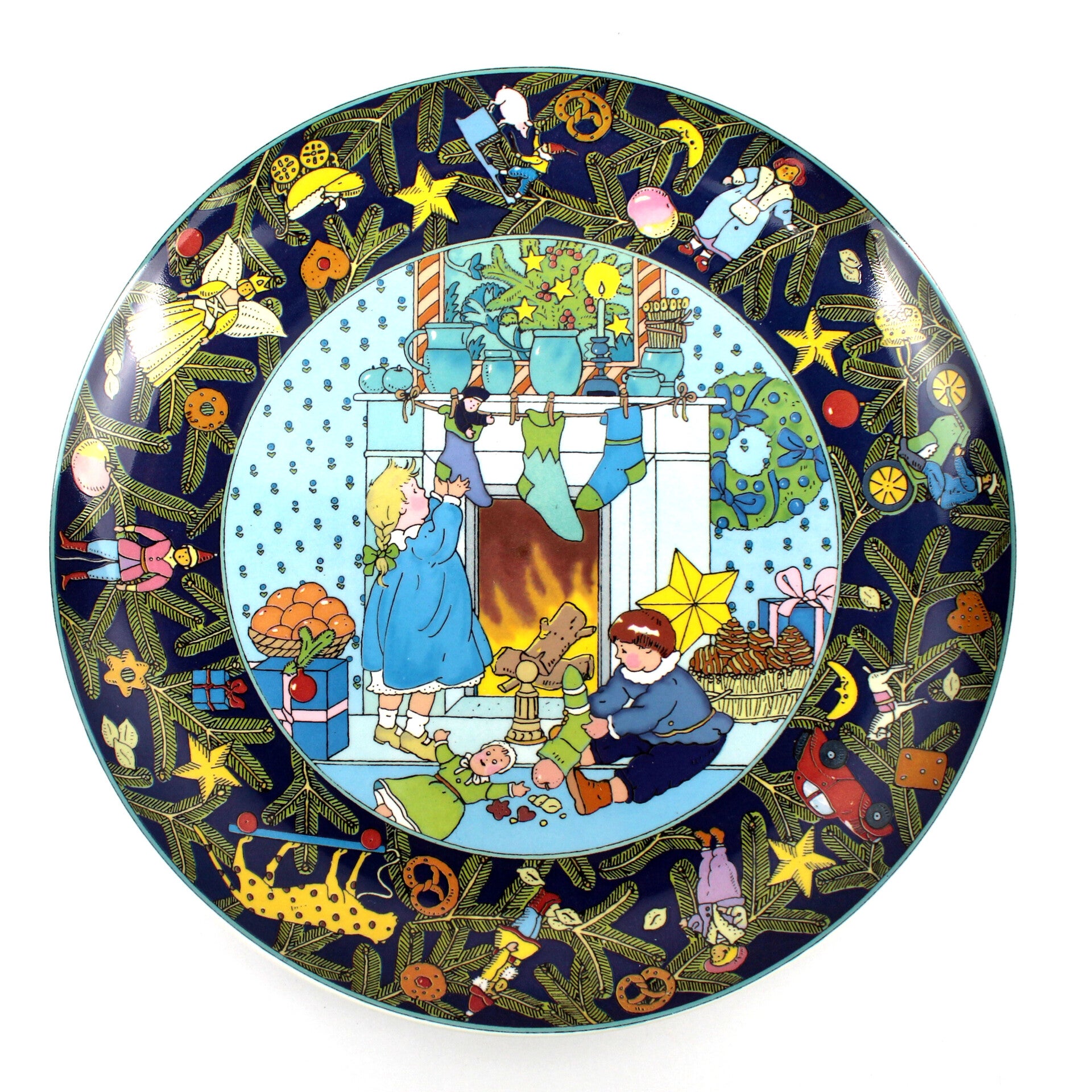 Prachtig groot decoratief kerstbord uit de serie Christmas in Europe van Villeroy & Boch, Duitsland. Dit bord draagt de titel “Groot Brittanië” en toont in het midden een charmante scène van twee kinderen voor de open haard die de kadootjes uit hun kerstsokken halen.