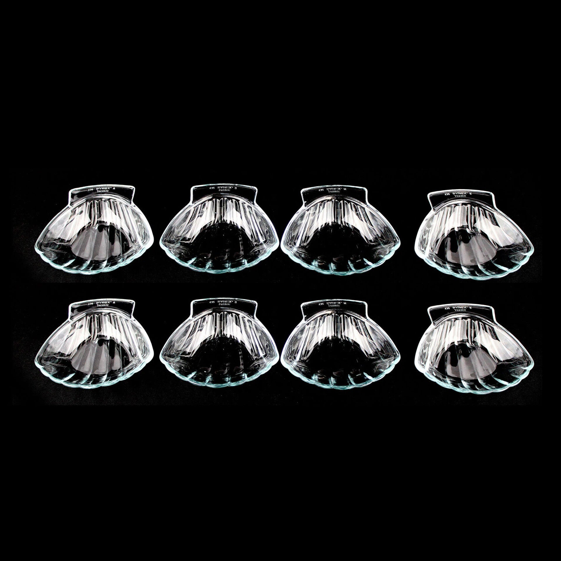 Acht mooie vintage schelpvormige schaaltjes van Pyrex.Perfect voor het serveren van feestelijke voorgerechten zoals coquilles, garnalencocktail of ceviche, maar ook ideaal als tapas schaaltjes of voor kleine desserts. Hitte en kou bestendig. Gemerkt met 435 PYREX E FRANCE.