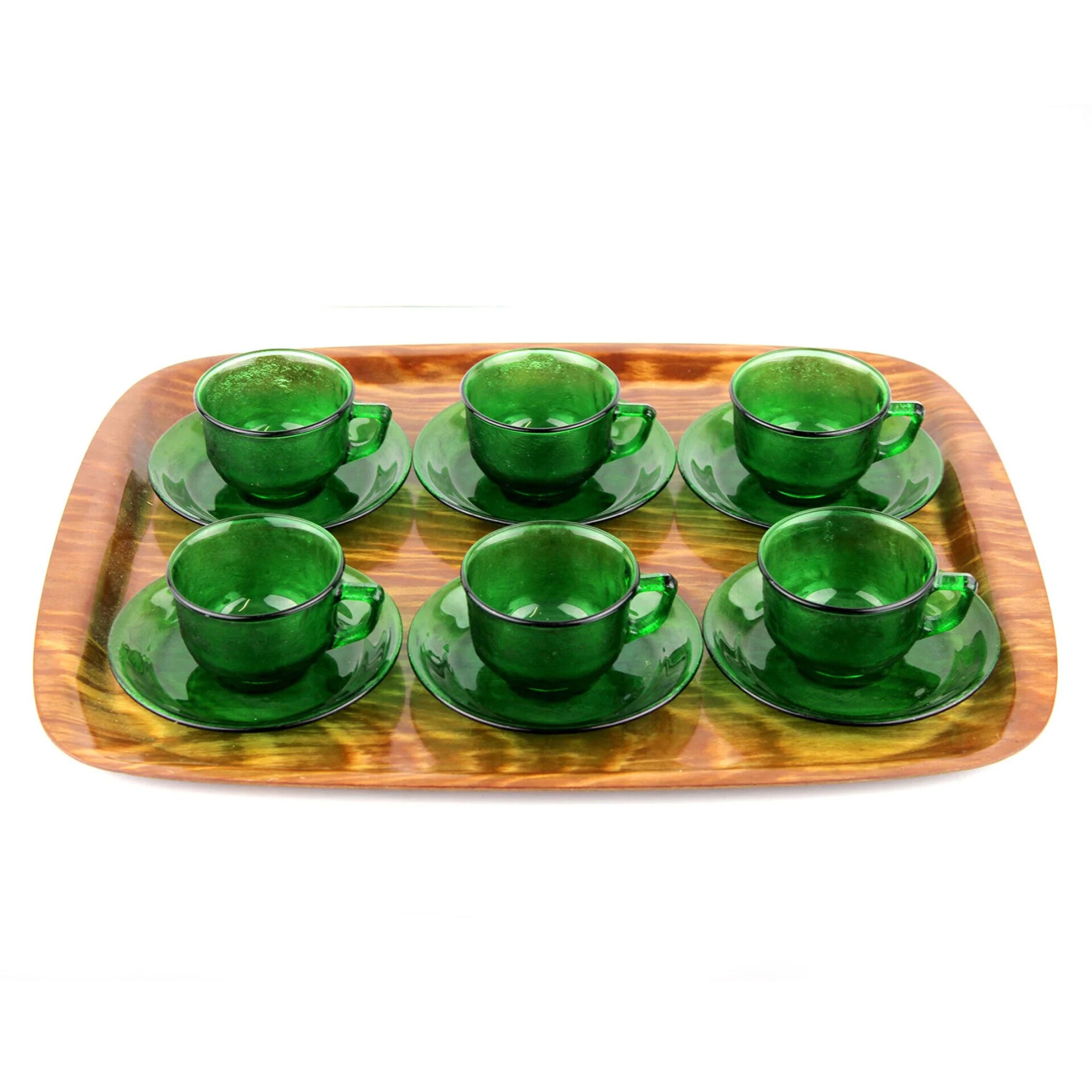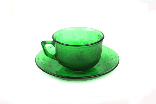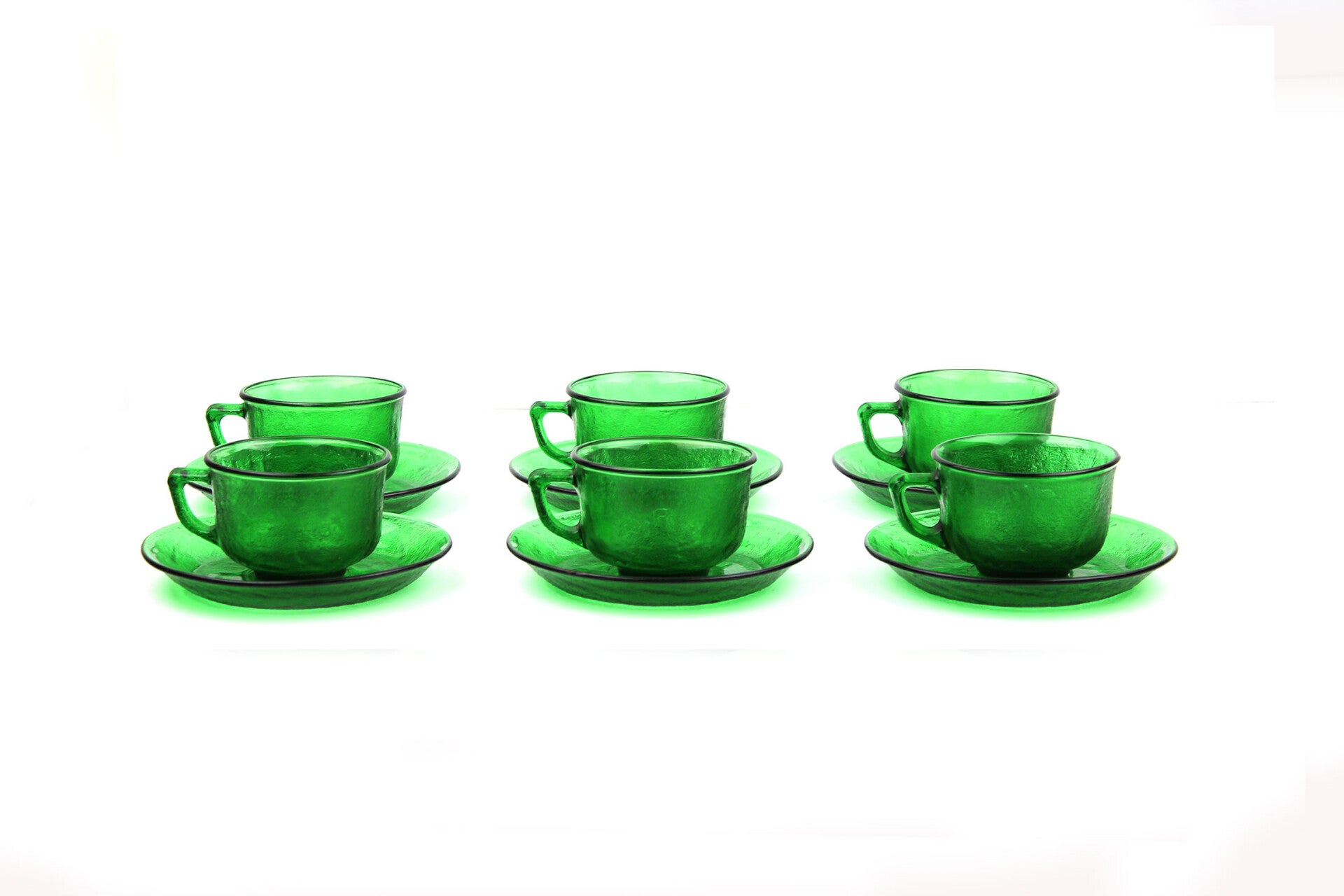 Perfect voor feestelijke koffiemomenten met Kerst en warme winterdiners deze prachtige vintage set van zes groene glazen koffiekopjes met bijpassende schotels. Het glaswerk heeft een sierlijk geruwd patroon, behalve aan de binnenzijde van de kopjes en de bovenzijde van de schotels, waardoor ze extra mooi glanzen op tafel.
