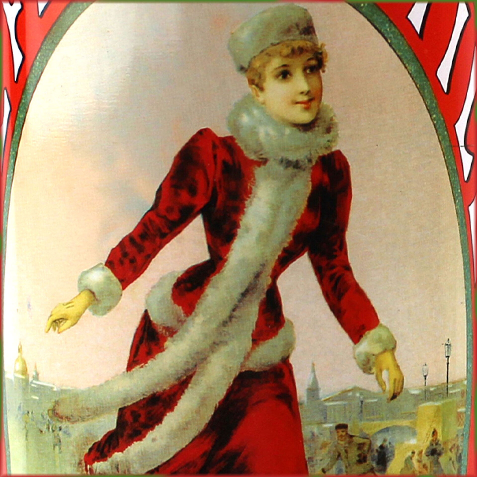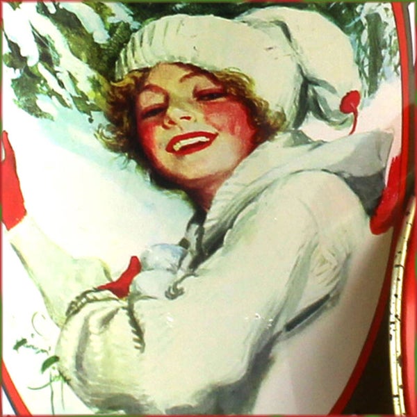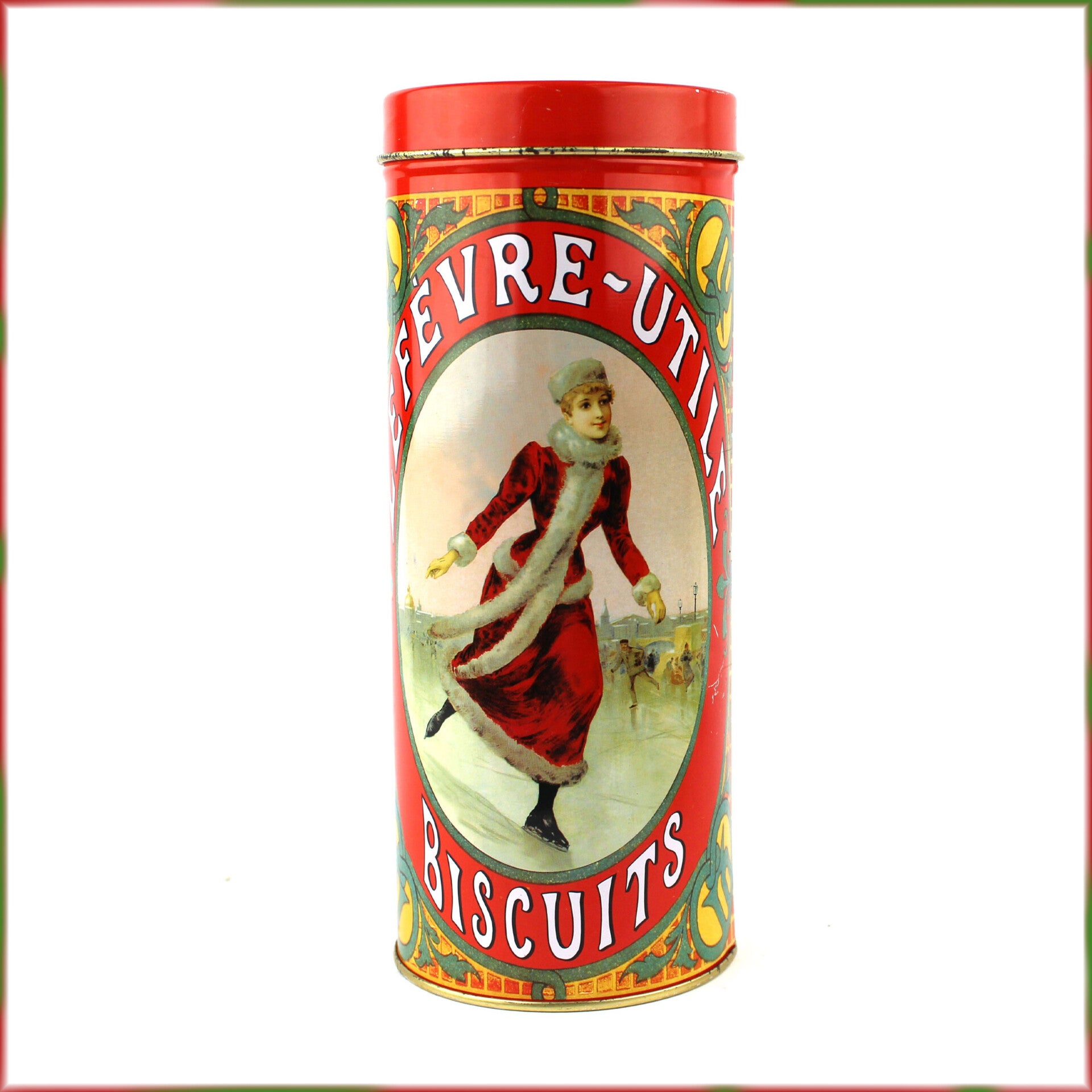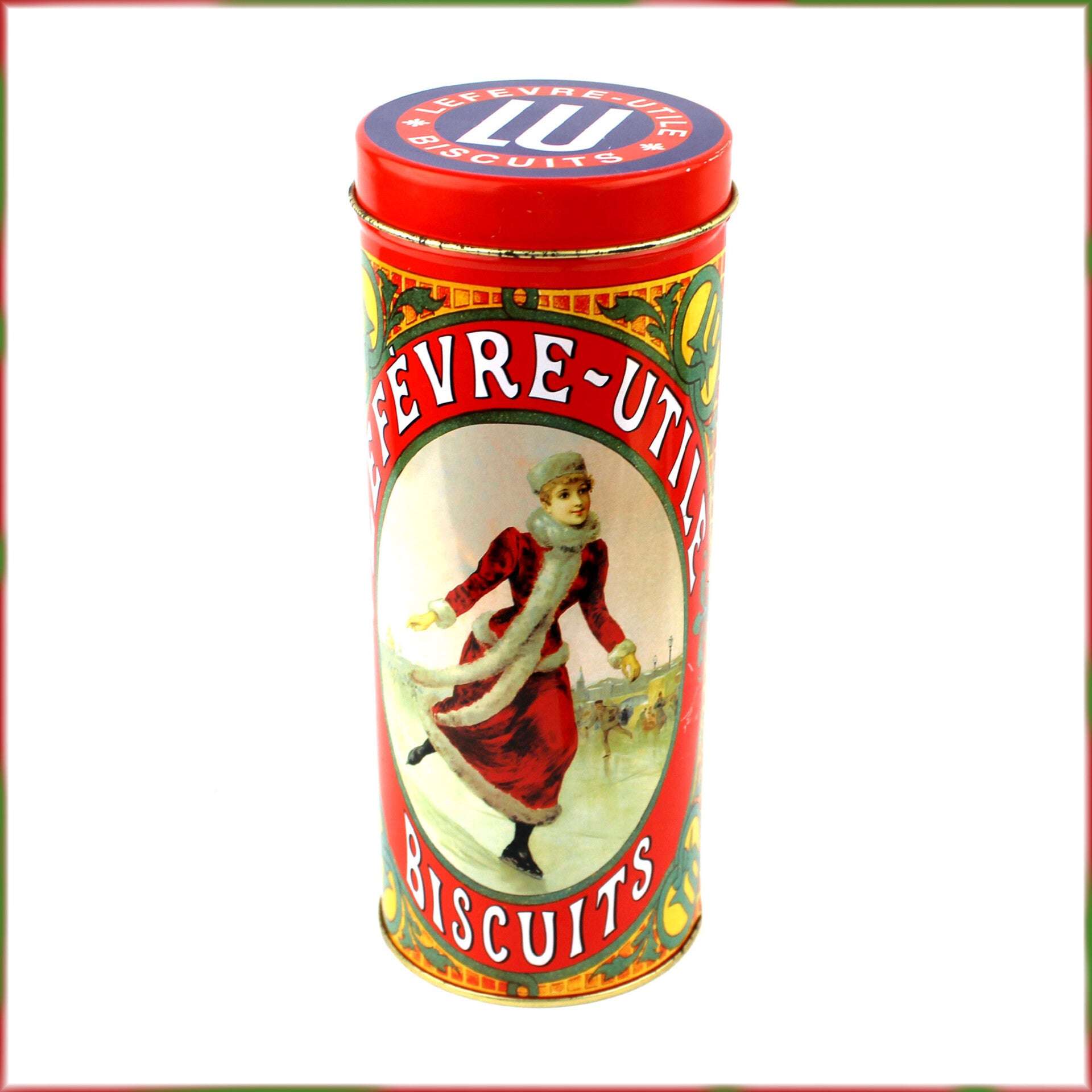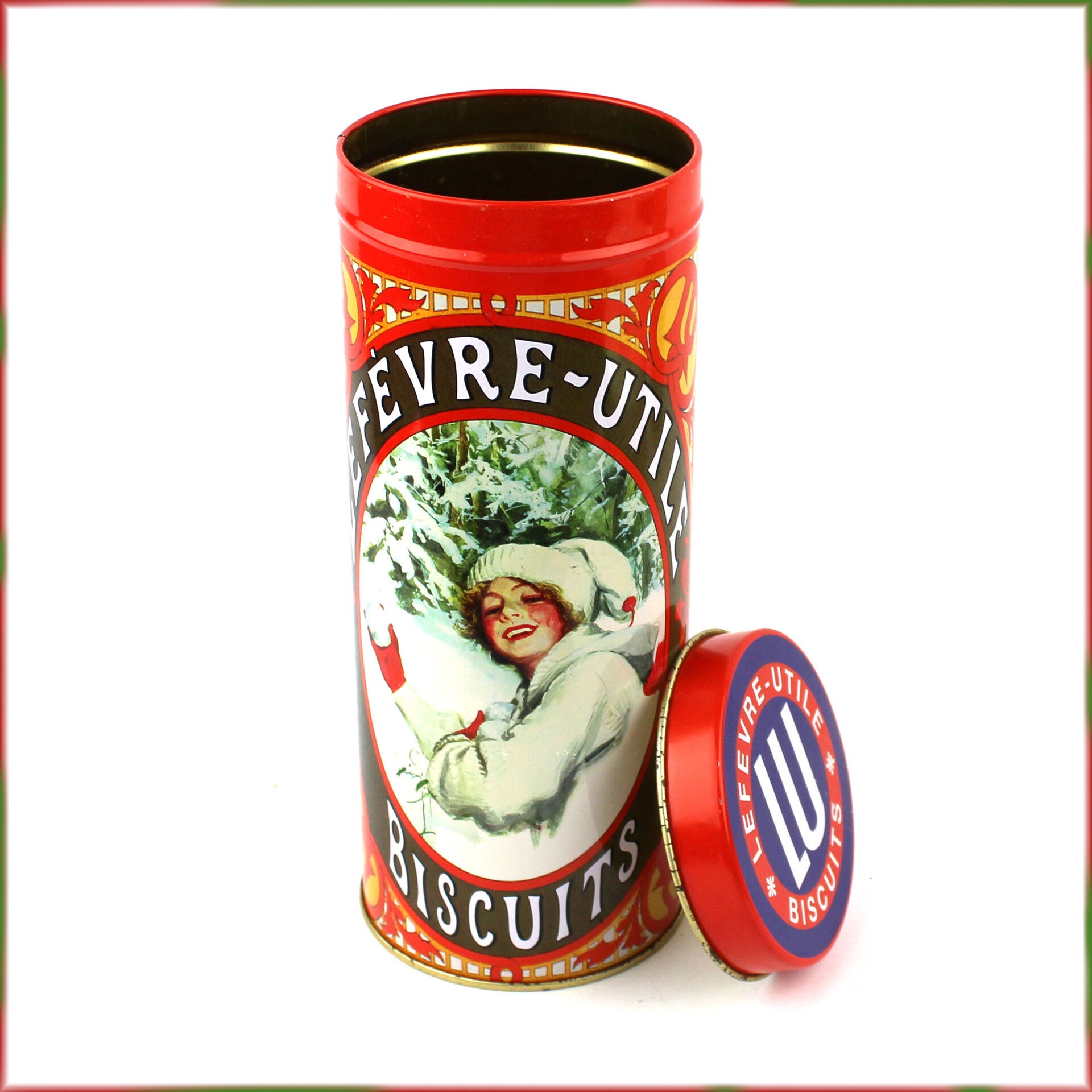 Het hoge, ronde blik heeft een losse deksel en is versierd met twee sfeervolle nostalgische winterafbeeldingen, waaronder de iconische LU-vrouw die sinds eind 19e eeuw door het merk werd gebruikt. Op het deksel prijkt het klassieke LU-logo.