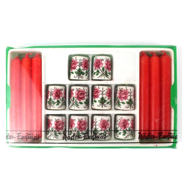 Vintage set van tien vintage mini kandelaars met rozendecoratie, gemaakt door Rösler Exquisit. De set bestaat uit 10 kandelaars met 10 rode kaarsen.