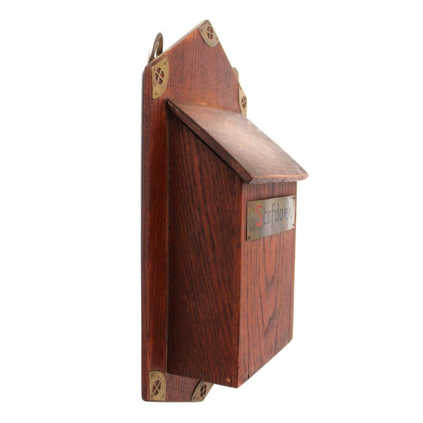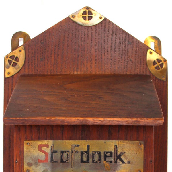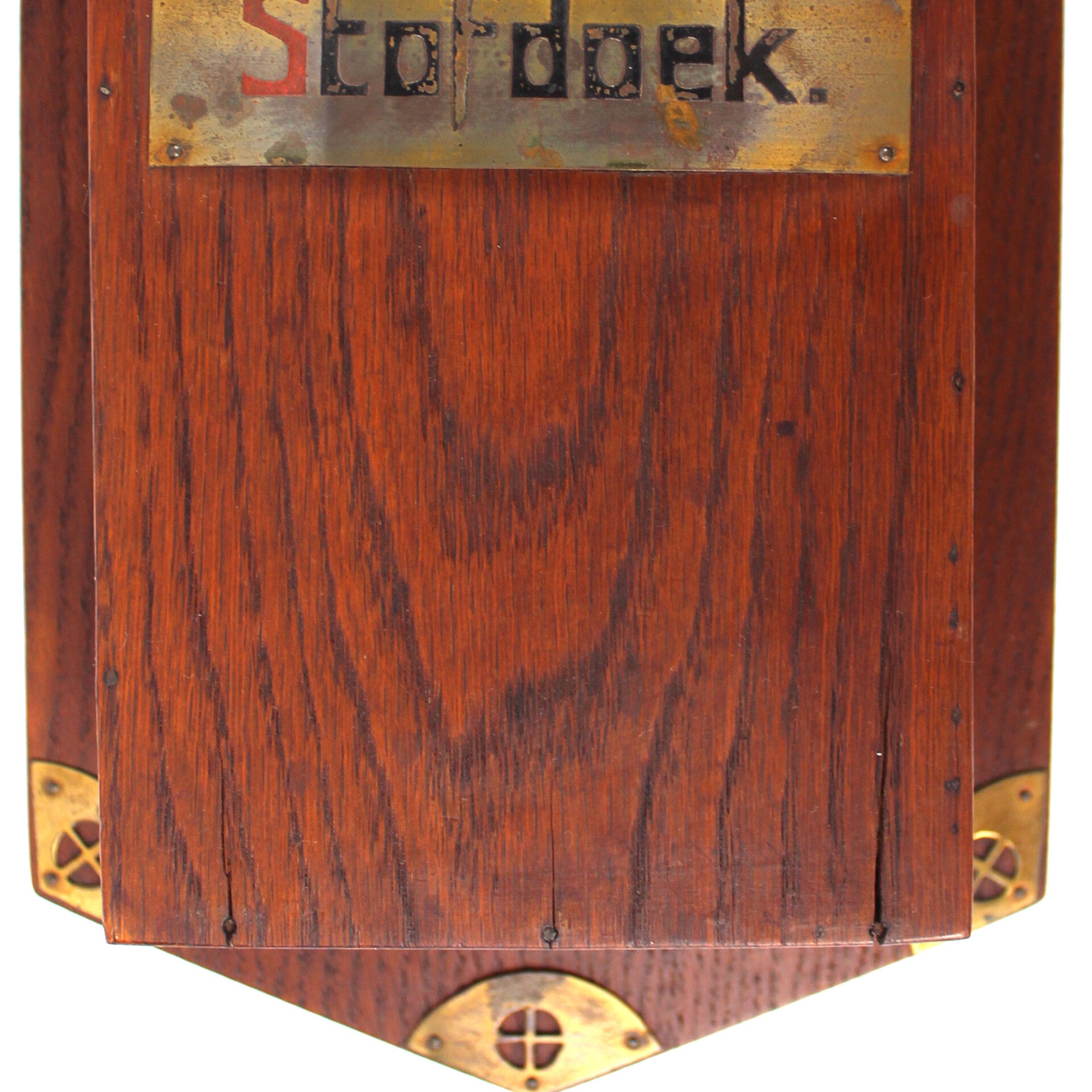 Vintage wandkastje van eikenhout met klep en bak voor het opbergen van de stofdoek. Het kastje is aan de boven- en onderzijde versierd met messing beslag, en op de voorkant bevindt zich een metalen plaatje met de handgemaakte tekst “Stofdoek.”