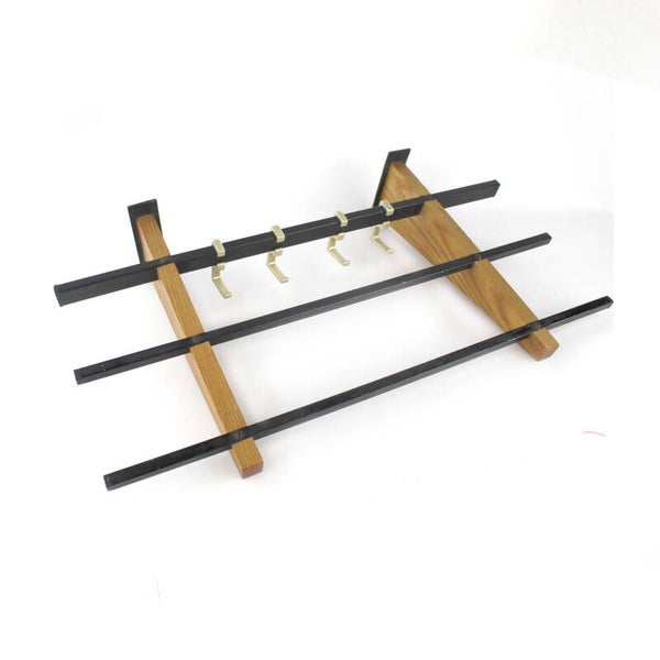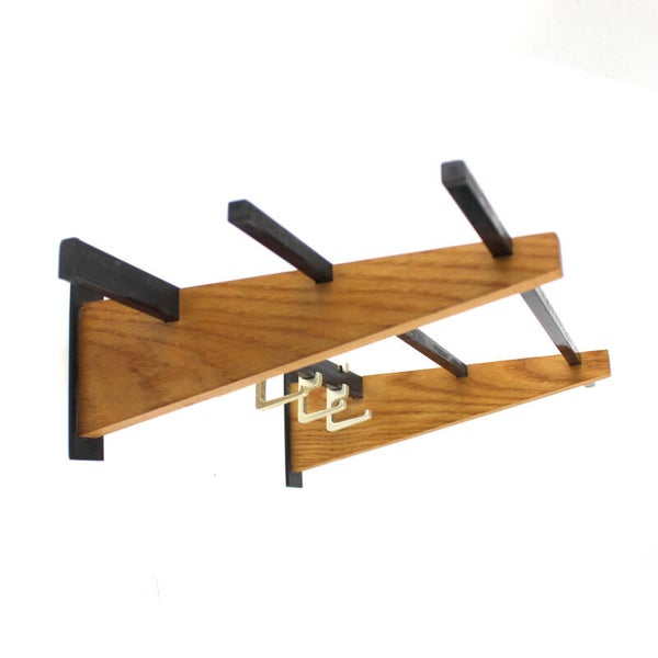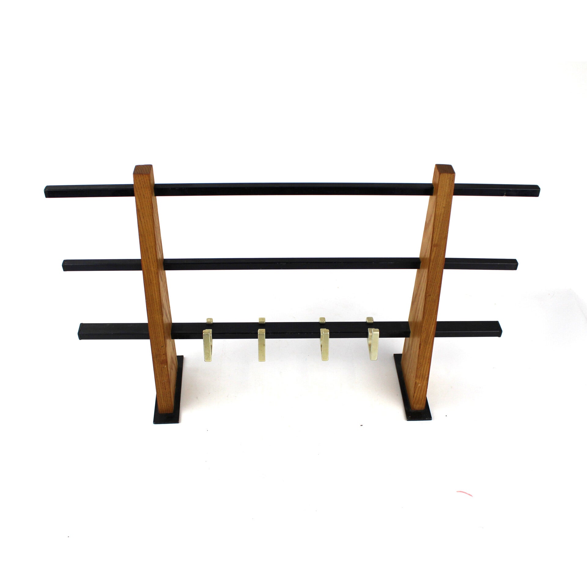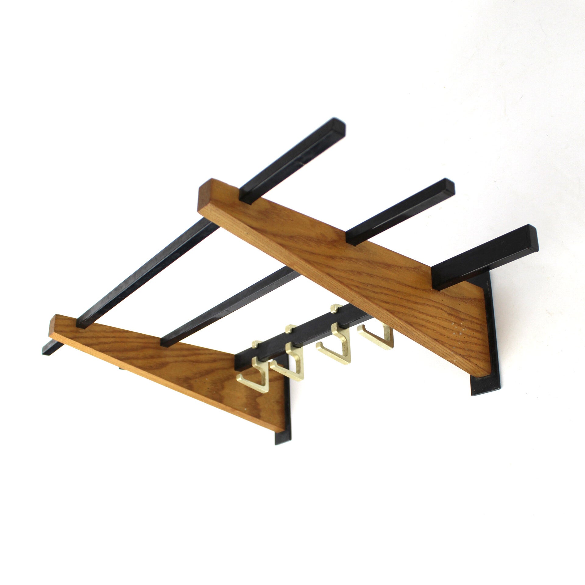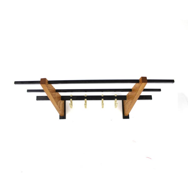 Kleine vintage wandkapstok uit de jaren 70, uitgevoerd in teakhout met een zwart gelakte metalen hoedenplank. De kapstok is voorzien van vier roestvrijstalen schuifhaken, ideaal voor het ophangen van jassen, tassen of sjaals.