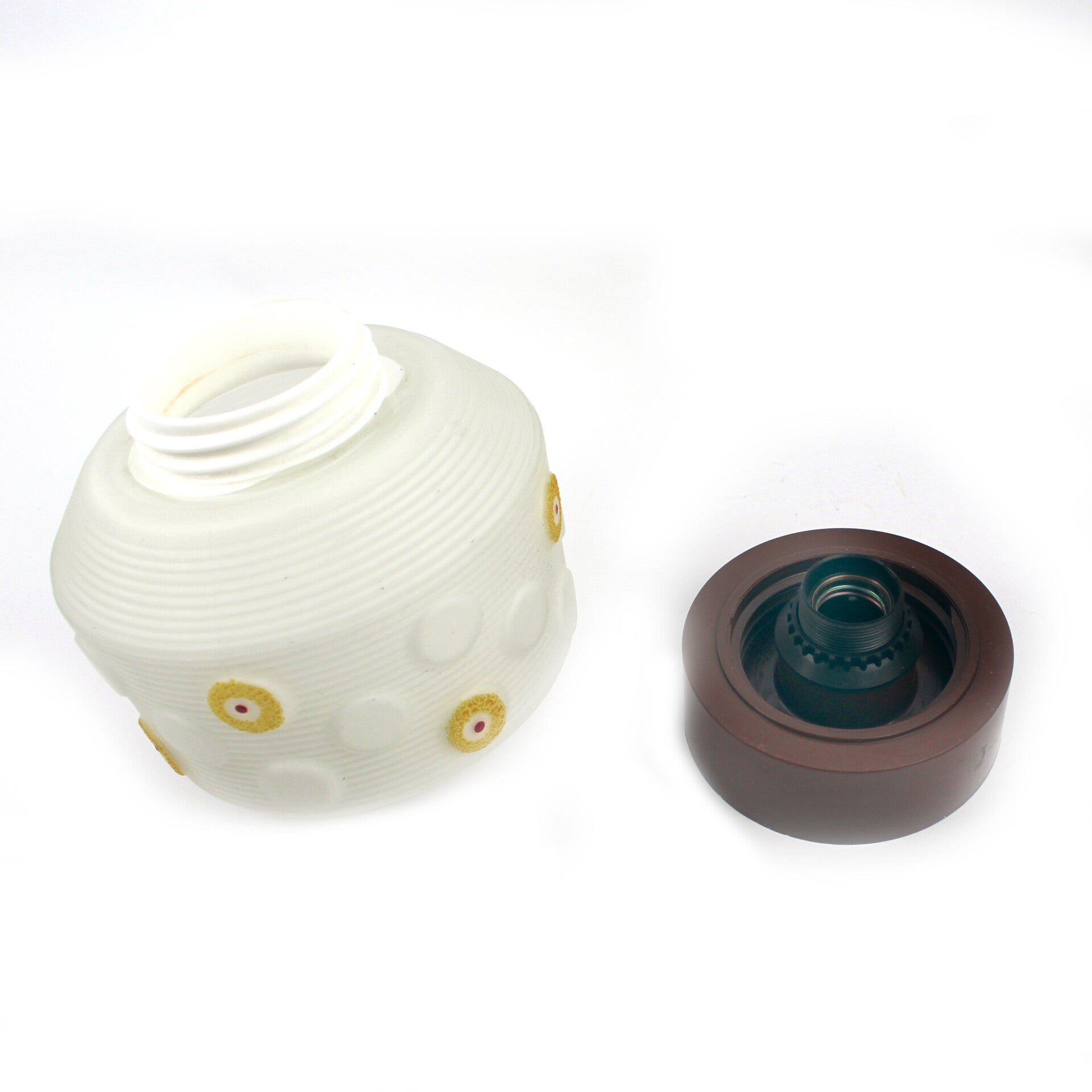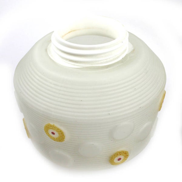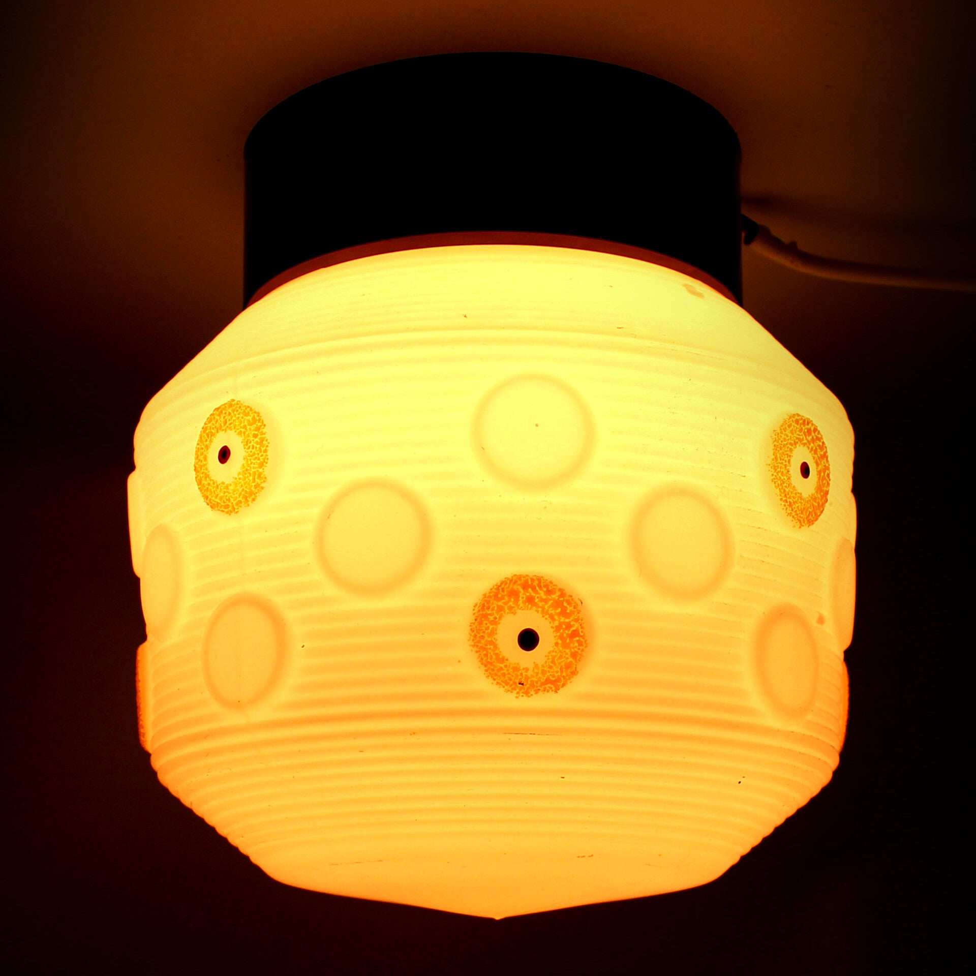 Charmante vintage plafondlamp uit de jaren ’50, gemaakt van wit melkglas in een compacte ronde vorm. De kap is gemaakt van wit matglas met een subtiel reliëf van lijnen en cirkels. Sommige cirkels zijn speels ingekleurd als gele bloemen met een rode kern, wat de lamp een vrolijke en karaktervolle uitstraling geeft.