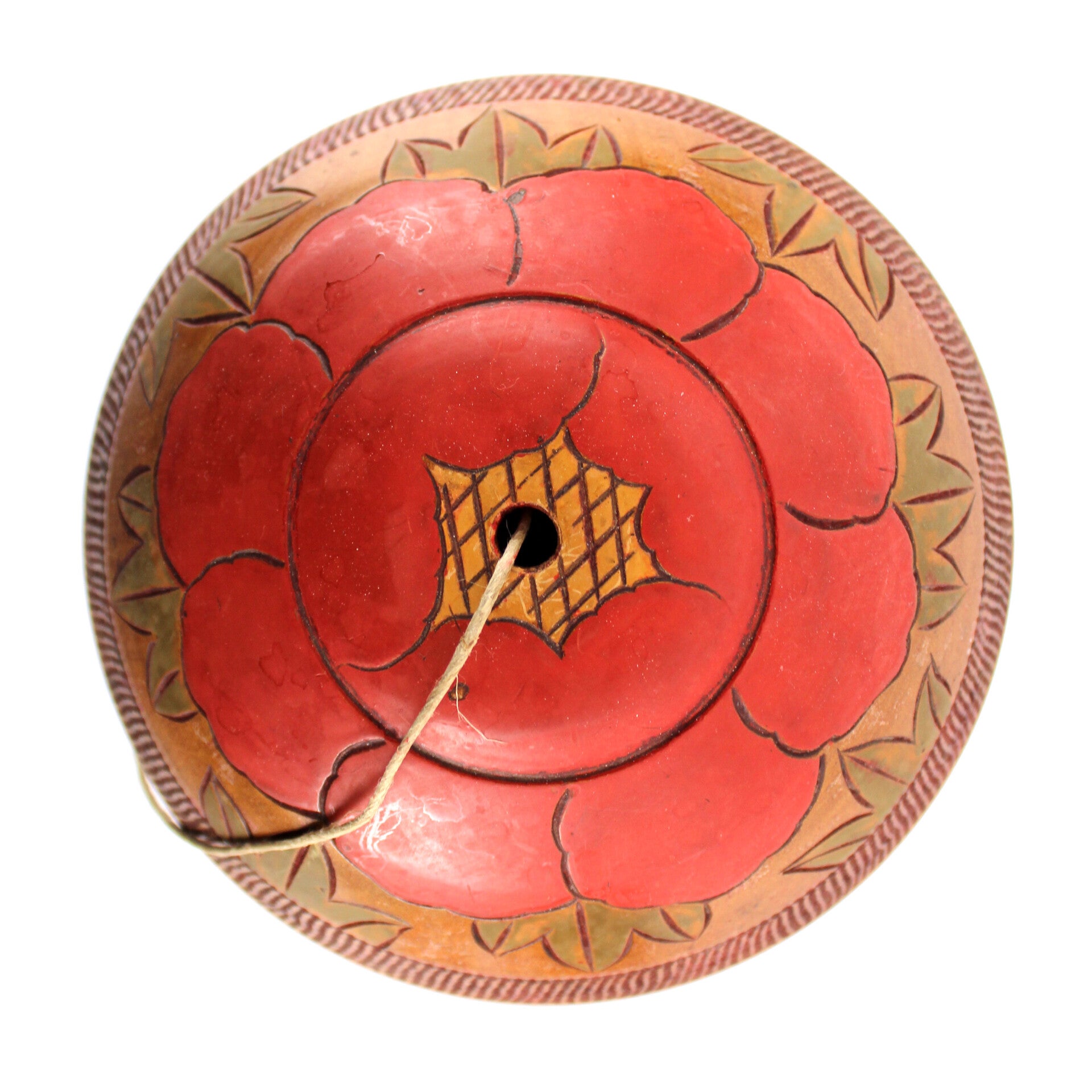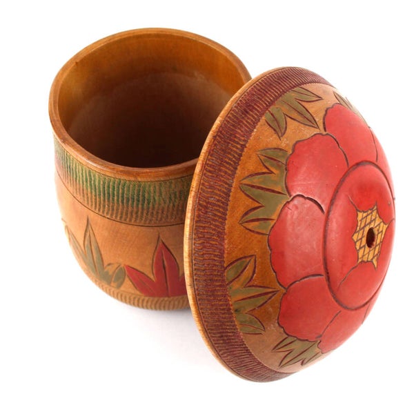 Bijzondere vintage houten breiwolhouder in paddenstoelvorm. Het bestaat uit een pot met een losse deksel met in het midden een opening voor het woldraad. De buitenzijde en deksel zijn prachtig bewerkt met bloemen in batik inkleuring.