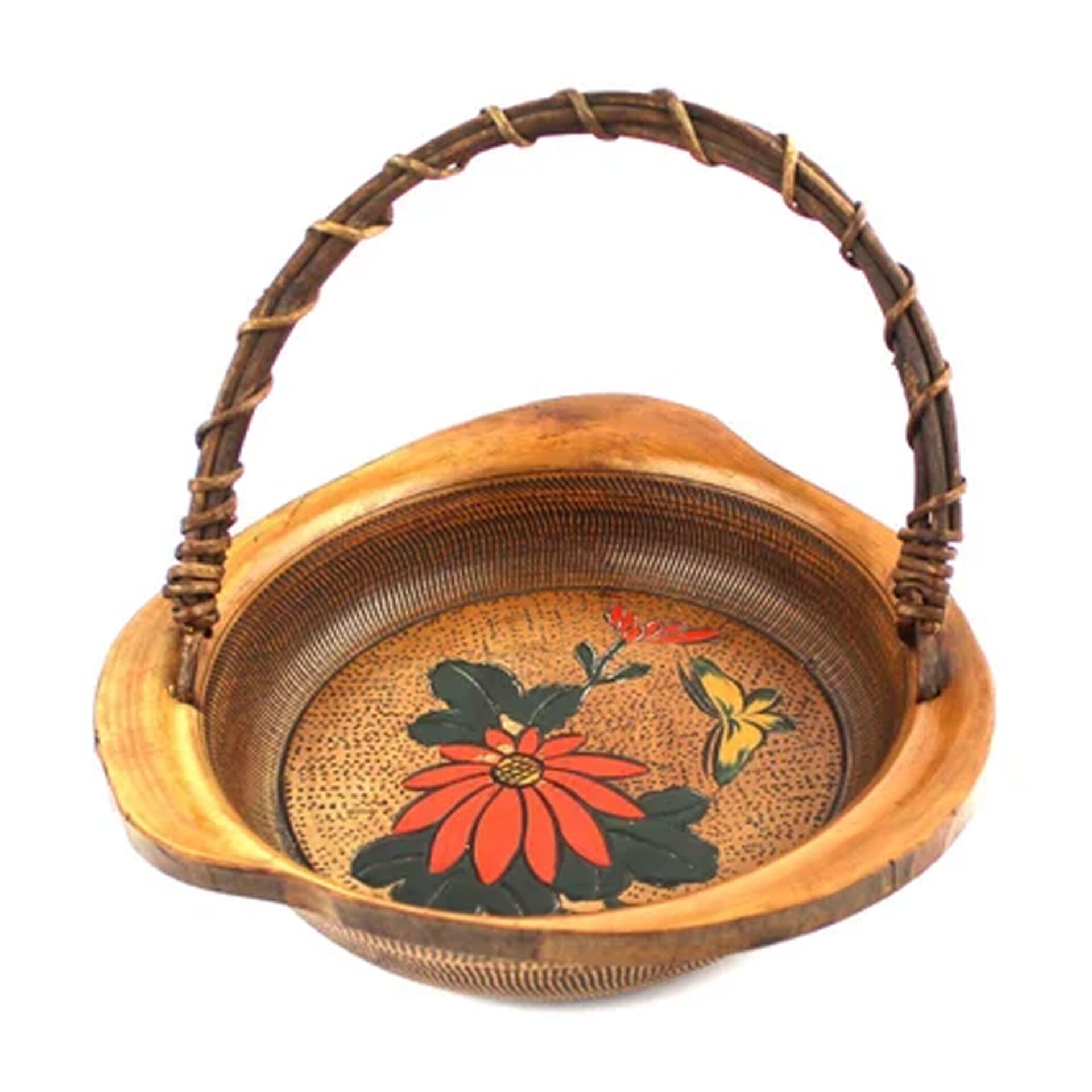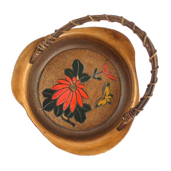Prachtige vintage handgemaakte schaal van hout met het originele rieten handvat. Op de bodem zijn rode bloemen, groene takken en een gele vlinder aangebracht in batik inkleuring.