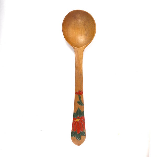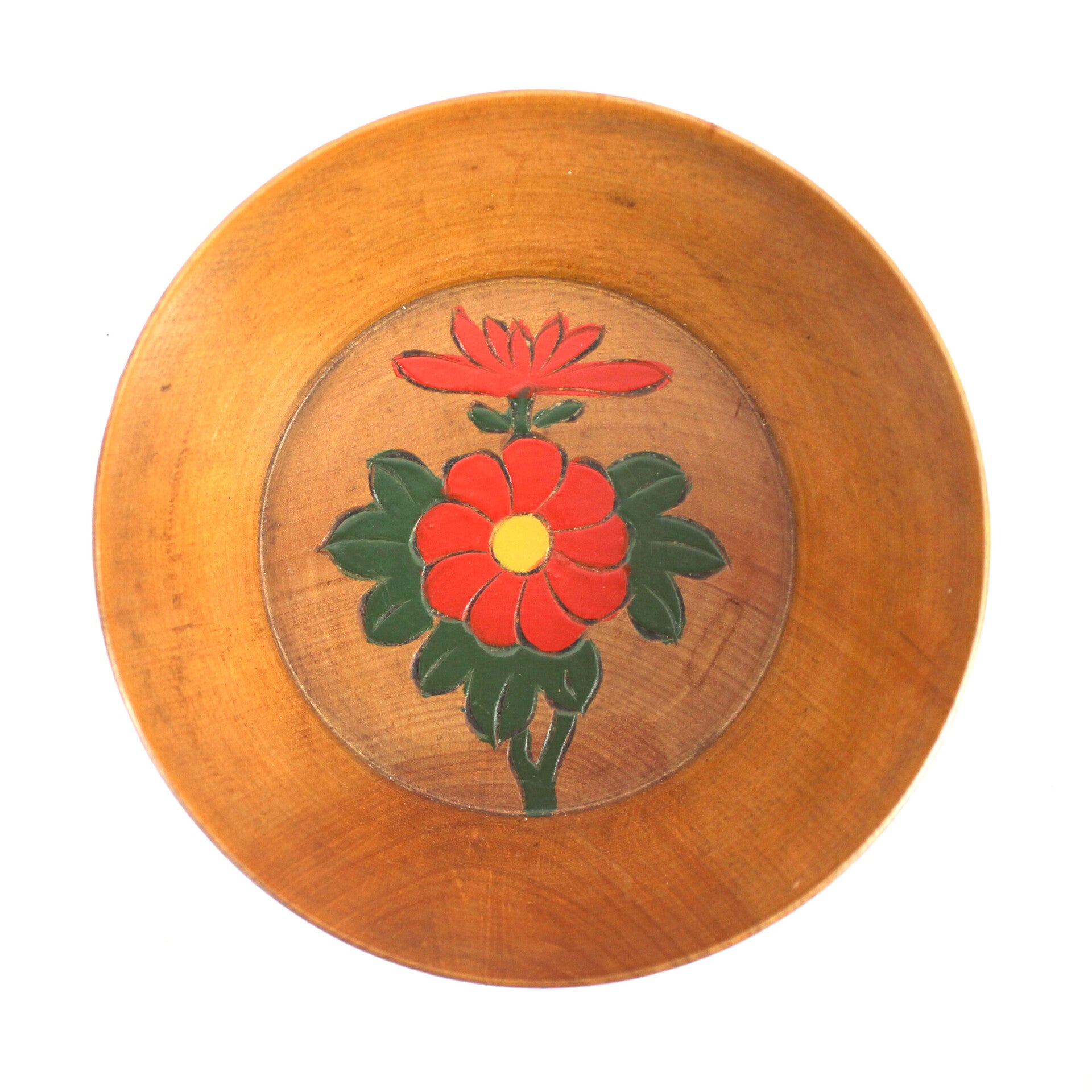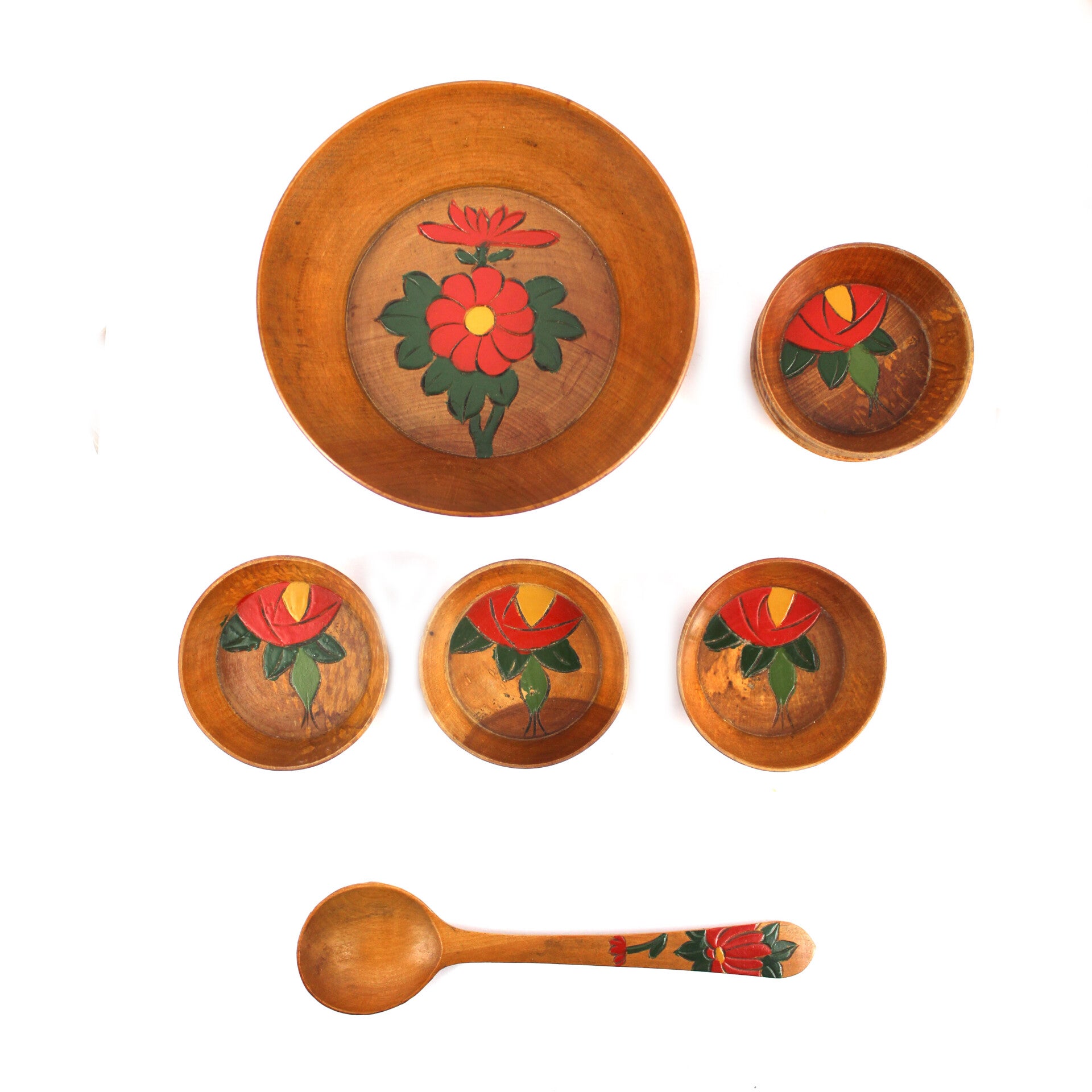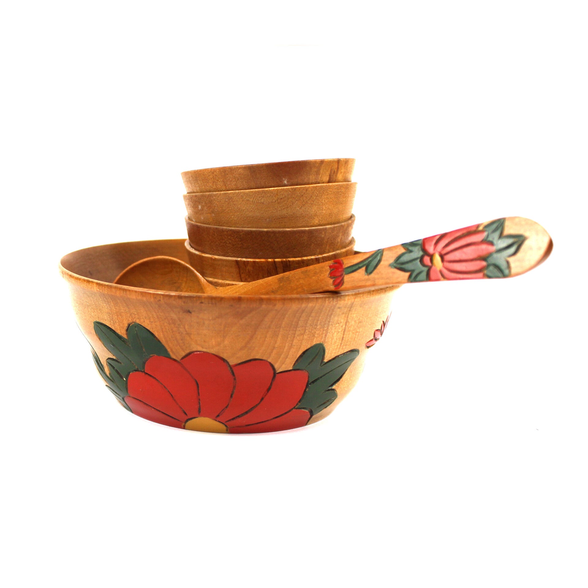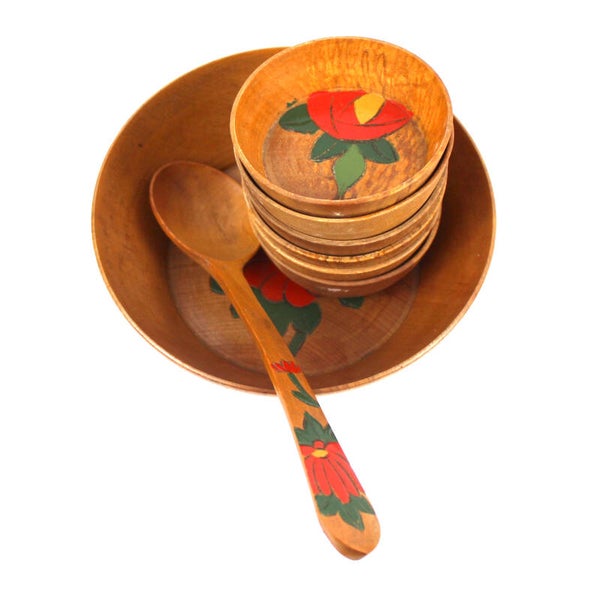 De schaal en bakjes zijn aan de binnenkant prachtig bewerkt met rode bloemen en groene bladeren in batik inkleuring. Dit komt ook terug op de lepel. Het verfijnde houtsnijwerk werd gemaakt in voormalig Nederlands-Indië, tijdens de periode van de Amsterdamse School (jaren 1920/30).