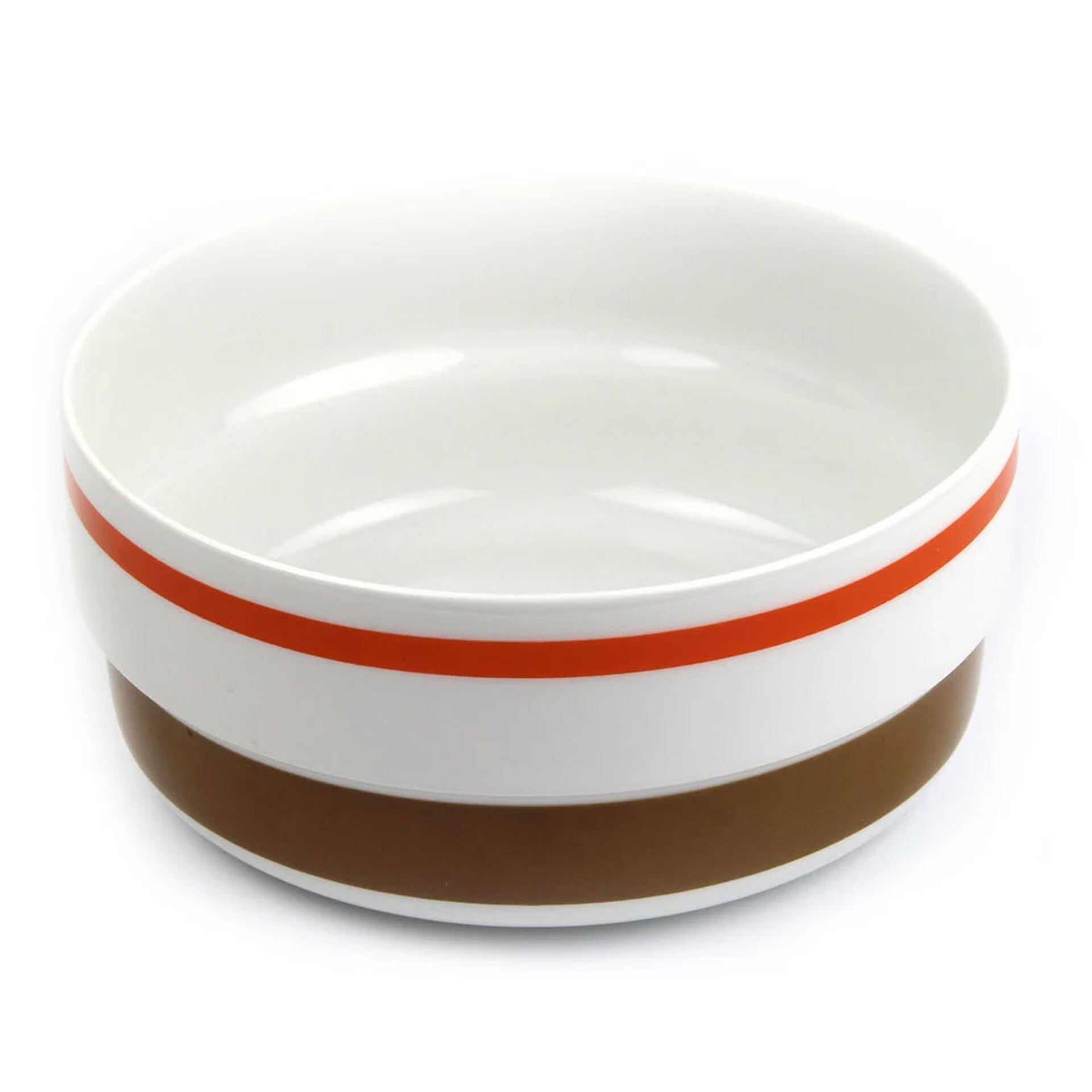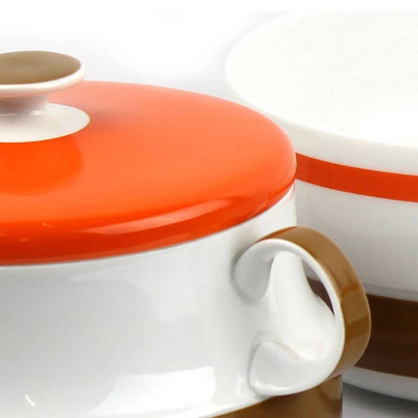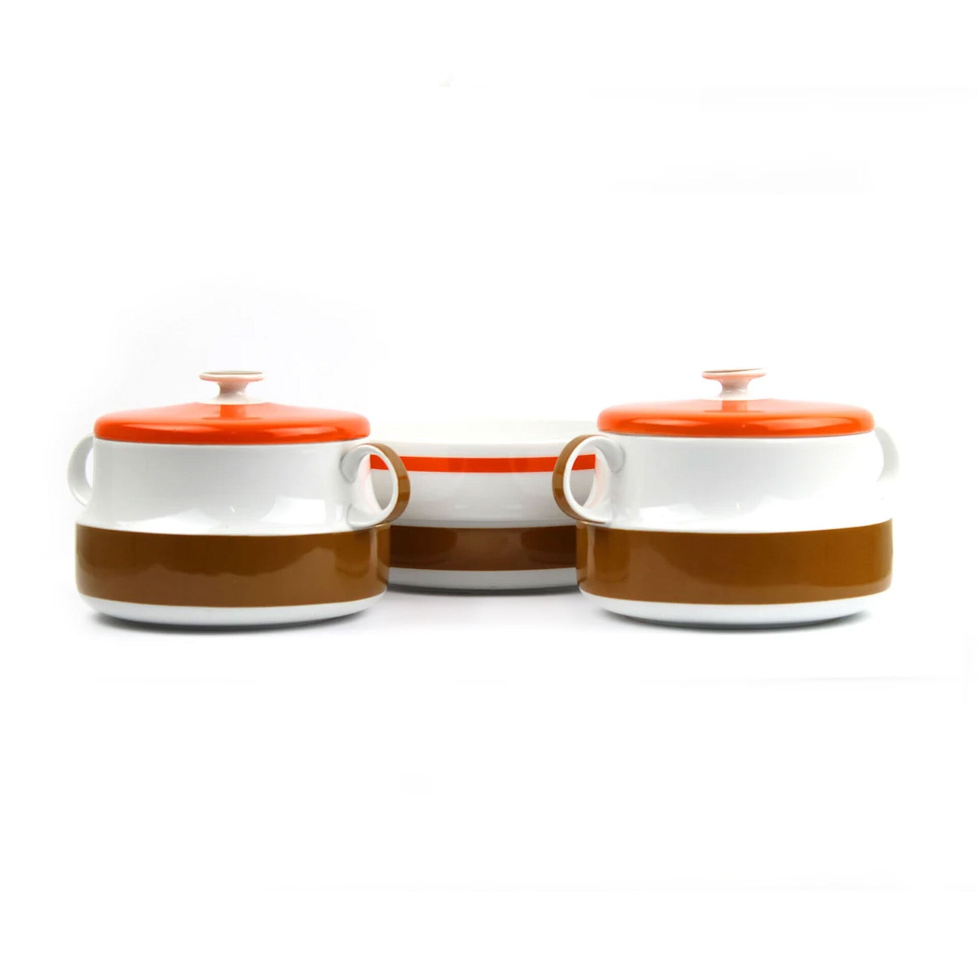Drie stijlvolle schalen van hoge kwaliteit, ontworpen door de Duitse designer Hans Theodoor Baumann. Deze vintage set bestaat uit twee dekschalen en één saladeschaal, uitgevoerd in een typisch seventies design met warme oranje en bruine tinten.