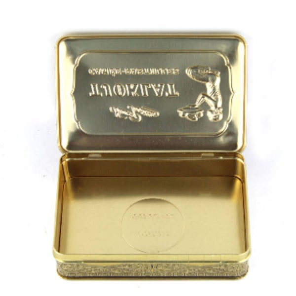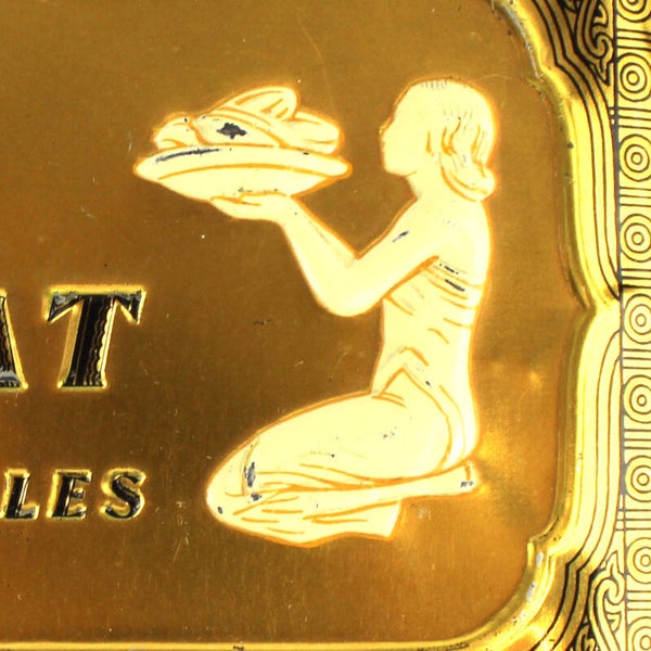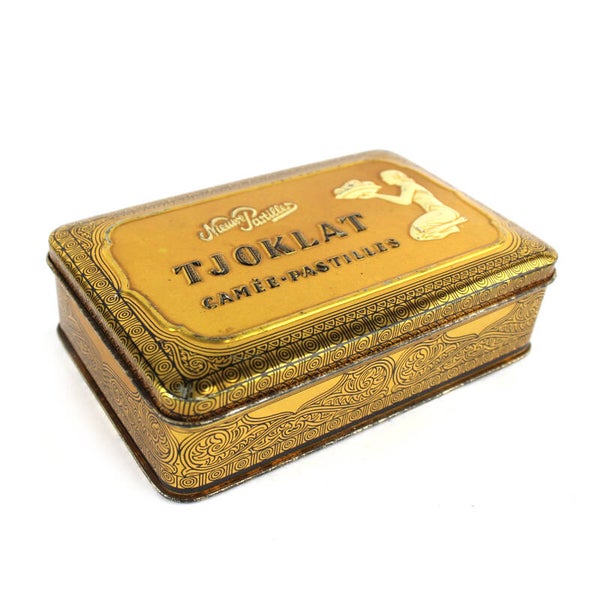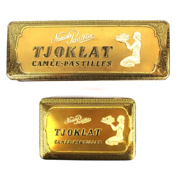 Prachtige set van twee vintage Tjoklat blikken met scharnierdeksel, gemaakt voor de iconische camée pastilles uit de jaren 60/70. De goudkleurige blikken zijn een ode aan het koloniale ontwerpverleden van het merk en dragen aan de voorzijde een reliëf van een knielende Indonesische vrouw met een schaal cacaovruchten in haar handen, een klassiek symbool van Tjoklat.