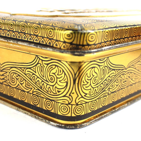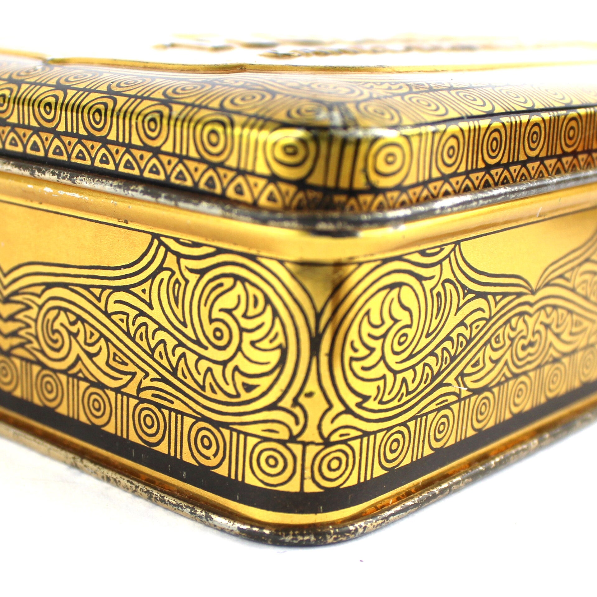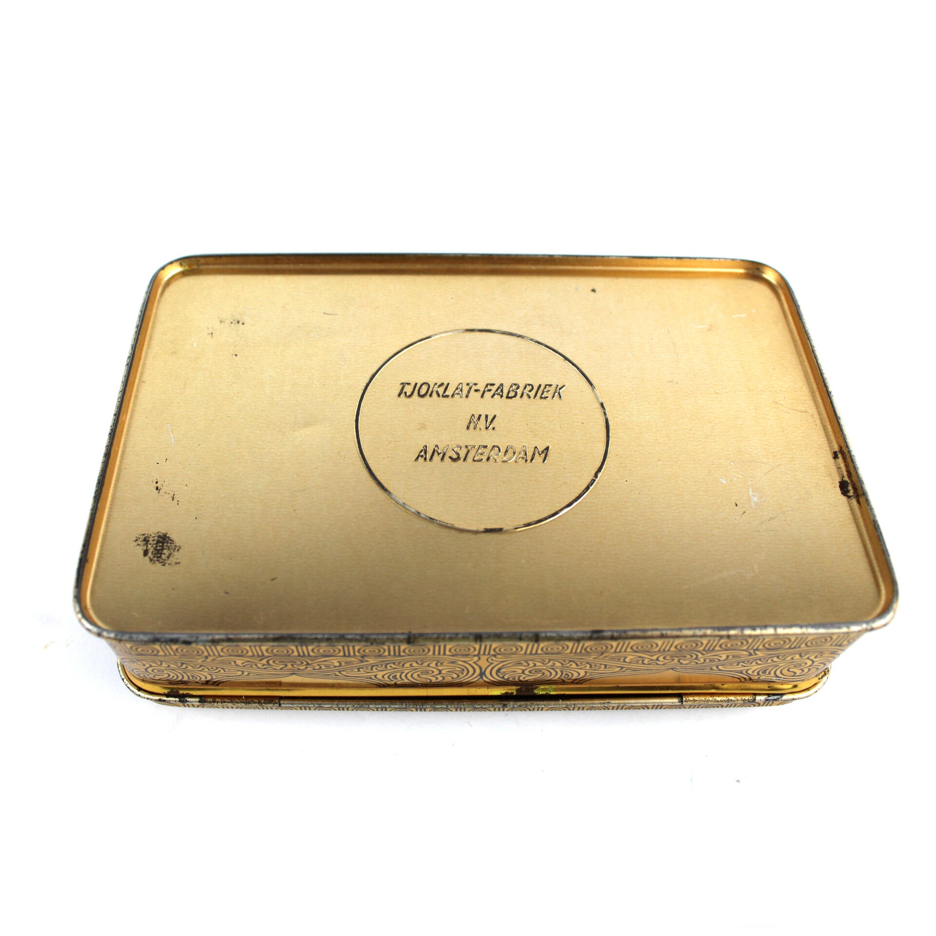 De zijkanten zijn subtiel gedecoreerd met lijn- en vormmotieven, en aan de onderzijde staat het geperste logo van Tjoklat Fabriek N.V. Amsterdam. Deze blikken zijn niet alleen fraai als verzamelobject, maar ook ideaal voor stijlvolle opbergruimte in keuken, kast of atelier.