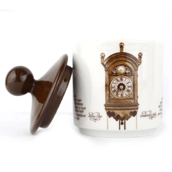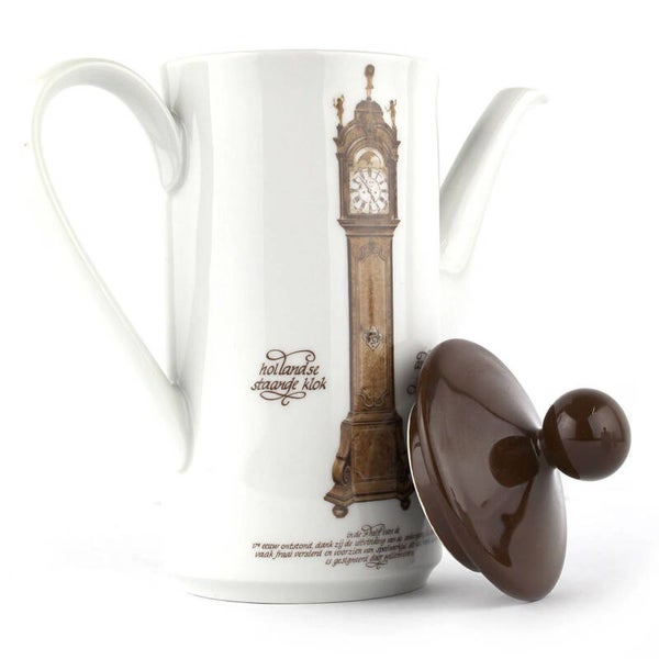Prachtige vintage kofiie set uit het iconische Klokken servies van Nutroma. Het witte porseleinen servies is versierd met klassieke bruine klokdecoraties en werd vervaardigd door Mitterteich Porzellan in Duitsland. In de jaren 70 verkrijgbaar door zegels te sparen bij koffiemelk.