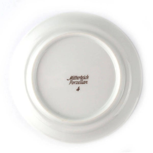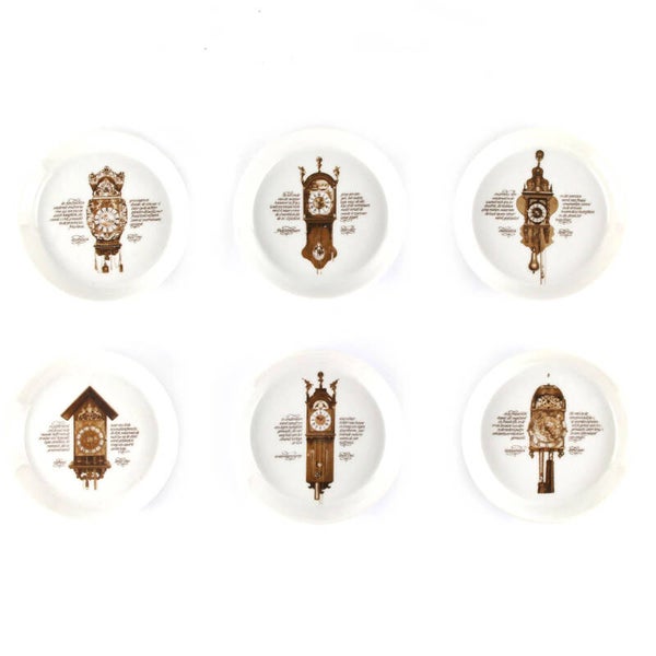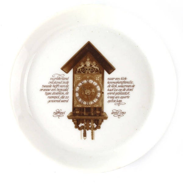 Prachtige vintage gebakschaal met 6 bordjes uit het iconische Klokken servies van Nutroma. Het witte porseleinen servies is versierd met klassieke bruine klokdecoraties en werd vervaardigd door Mitterteich Porzellan in Duitsland. In de jaren 70 verkrijgbaar door zegels te sparen bij koffiemelk.