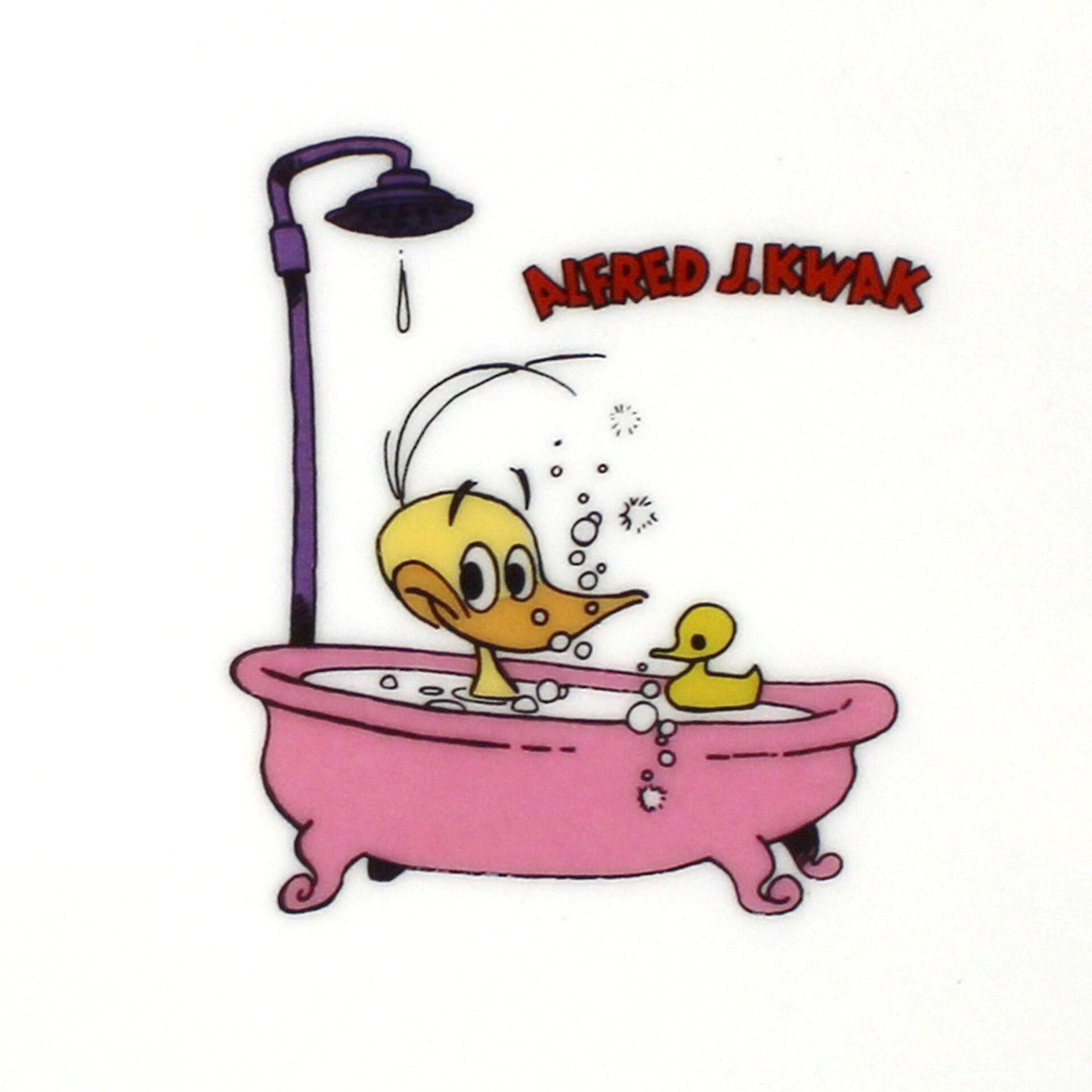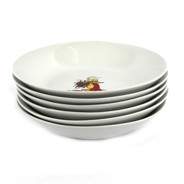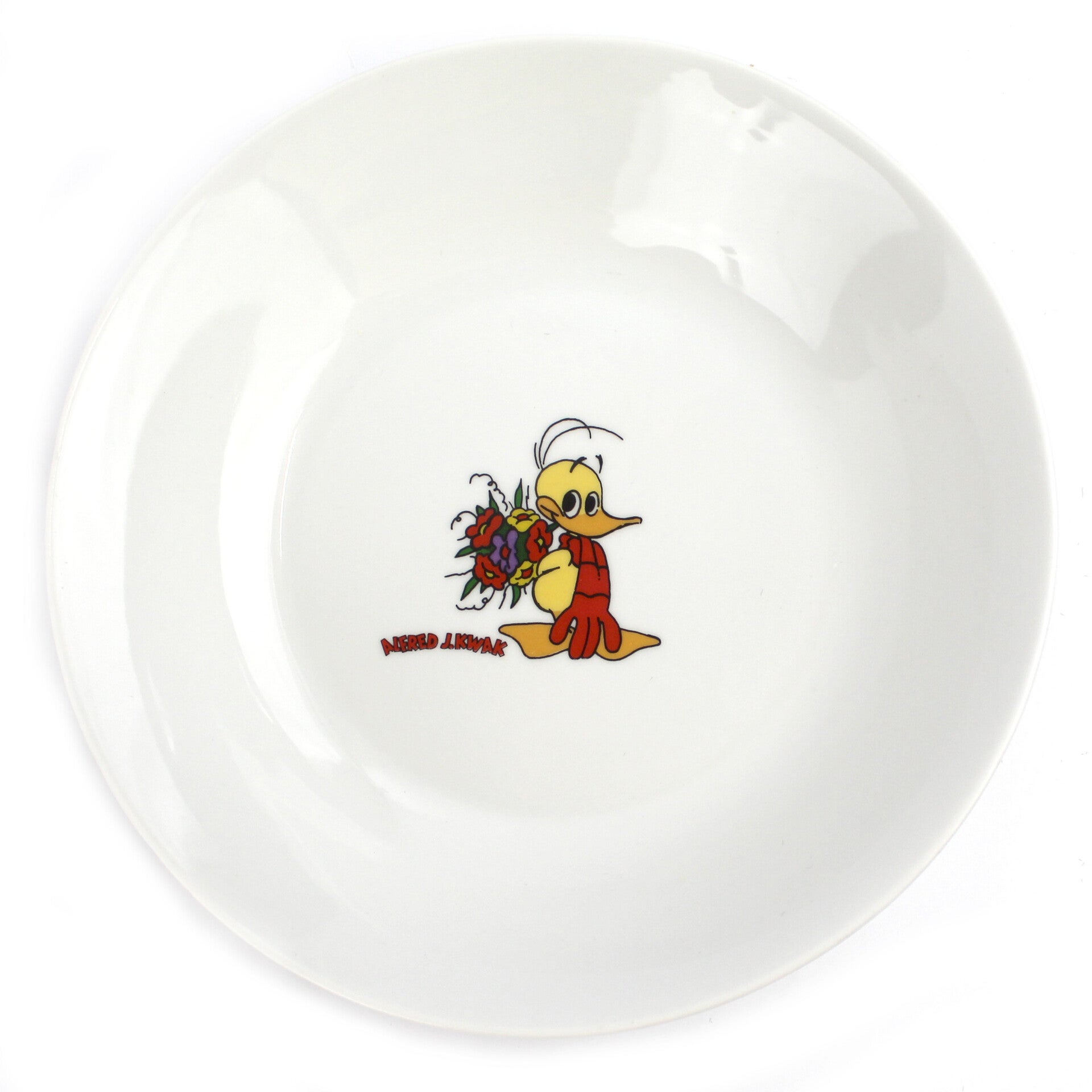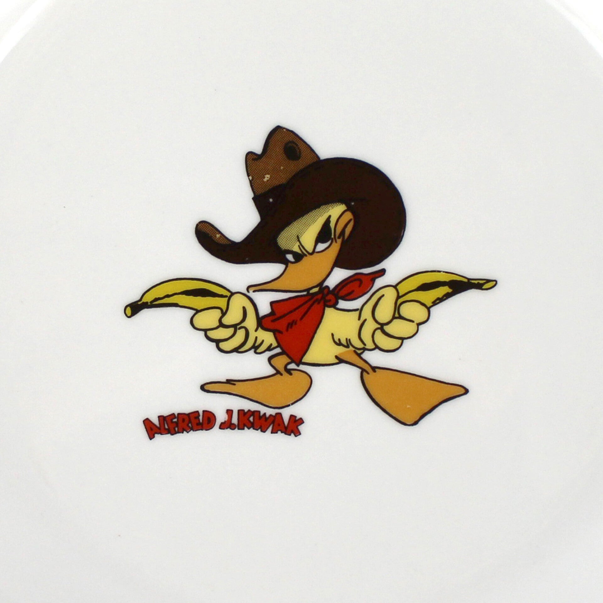 Zes vrolijke vintage kinderborden van wit keramiek, perfect voor pap, avondeten of een gezellige maaltijd. Elk bord is versierd met een kleurrijke afbeelding van Alfred Jodocus Kwak, het geliefde eendje van tekenaar Harald Siepermann.