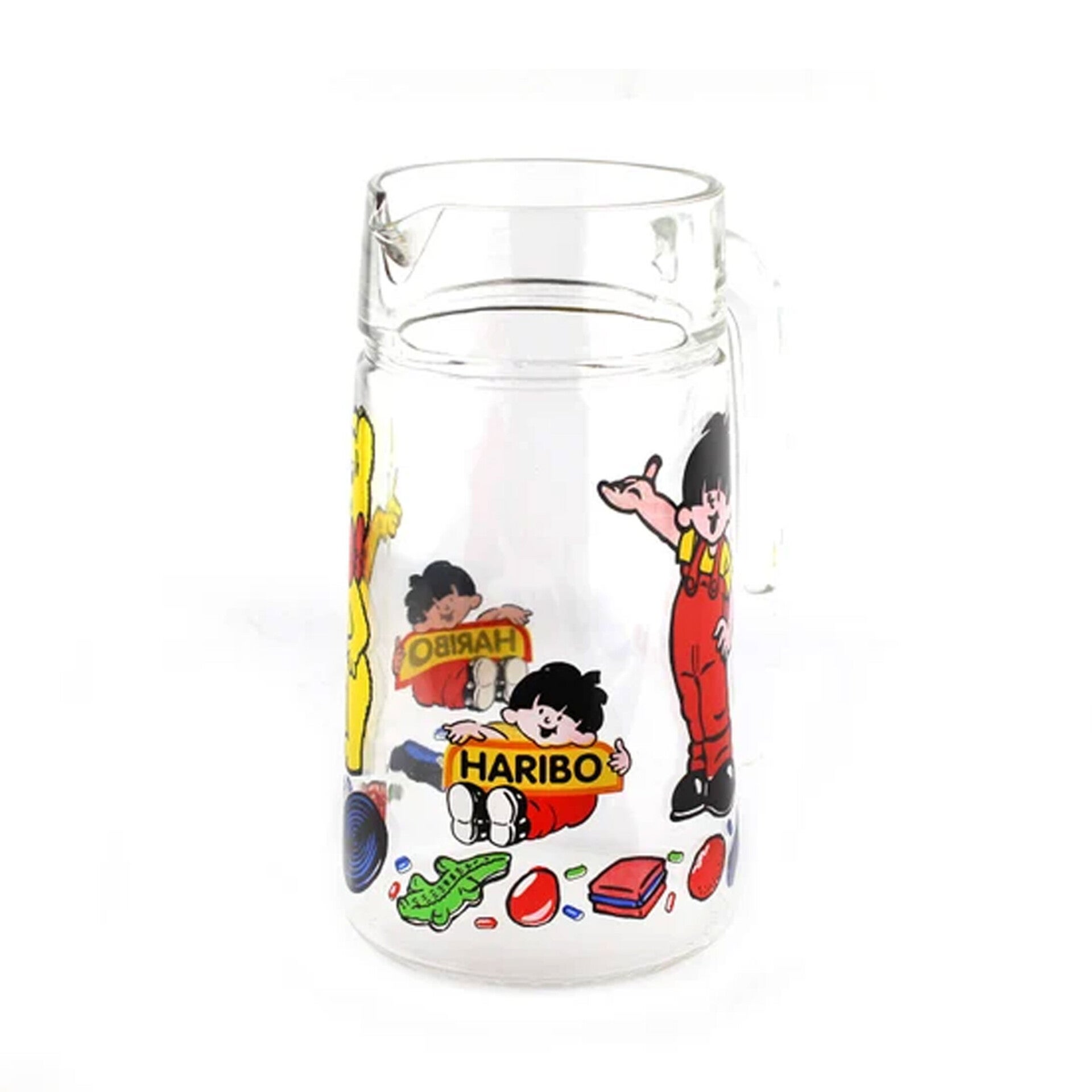 Leuke vintage limonadeset van Haribo, geproduceerd in de jaren 90 door Luminarc Frankrijk voor Haribo Duitsland. Deze vrolijke set bestaat uit een limonadekan en zes bijpassende glazen, allemaal versierd met illustraties van de Haribo beer, snoepjes en een jongetje, een feest van herkenning voor fans van Haribo en retro keukenspullen.