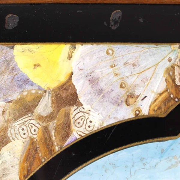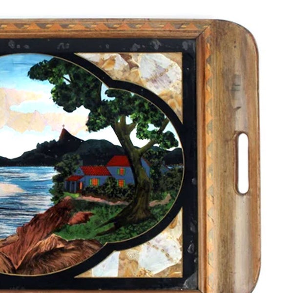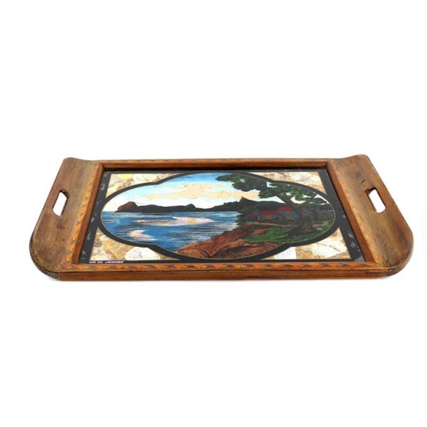 Prachtig en zeldzaam vintage dienblad uit de jaren 50, handgemaakt in Brazilië. Dit unieke exemplaar toont een kleurrijke voorstelling van Rio de Janeiro, ingelegd met echte vlindervleugels onder glas, wat zorgt voor een schitterend iriserend effect.