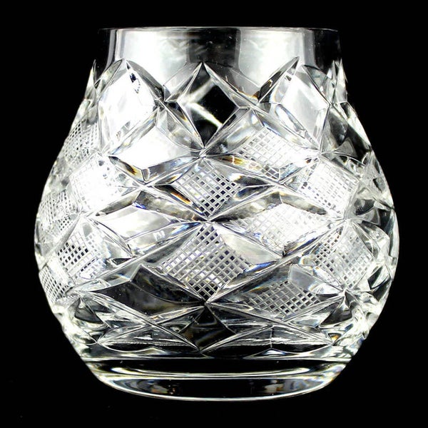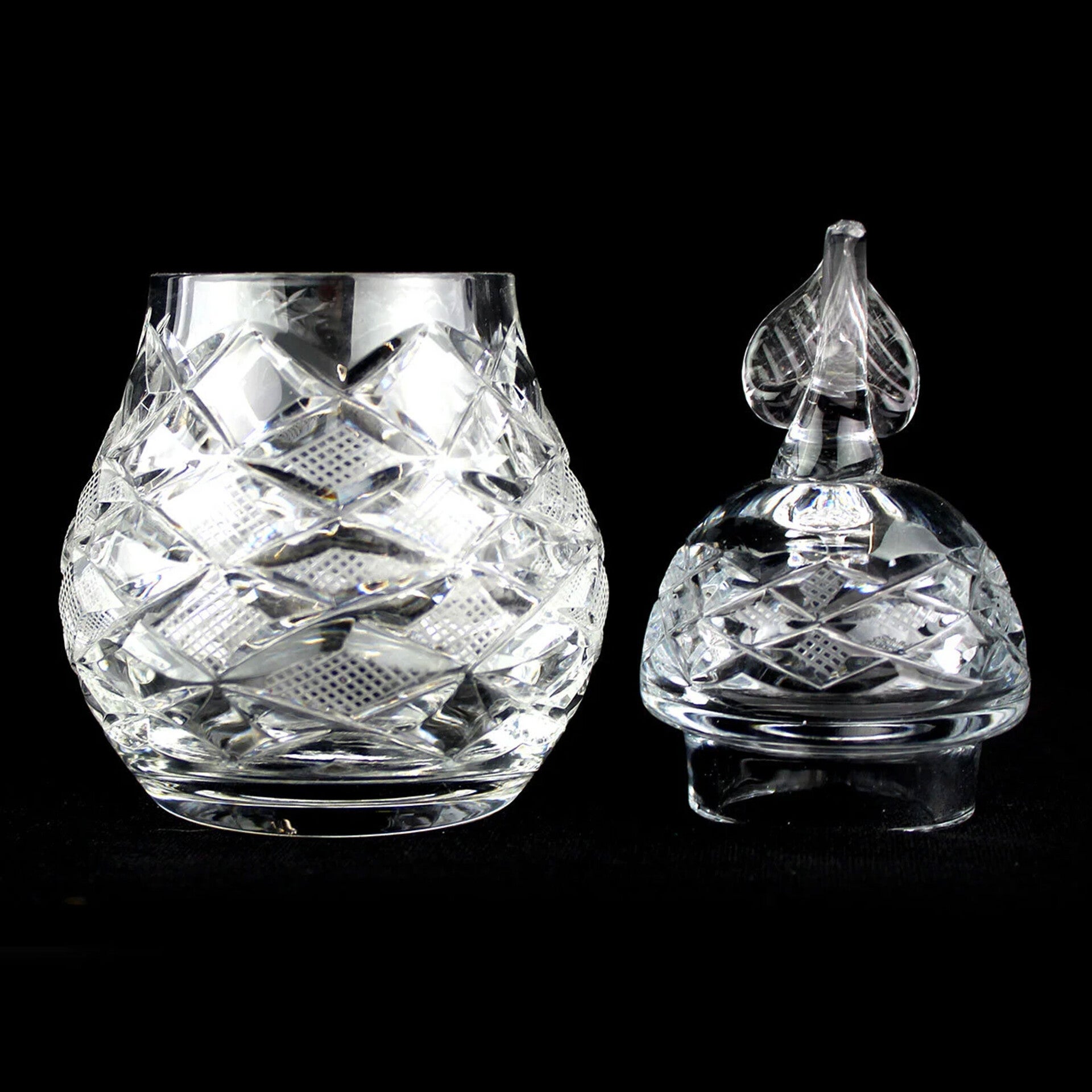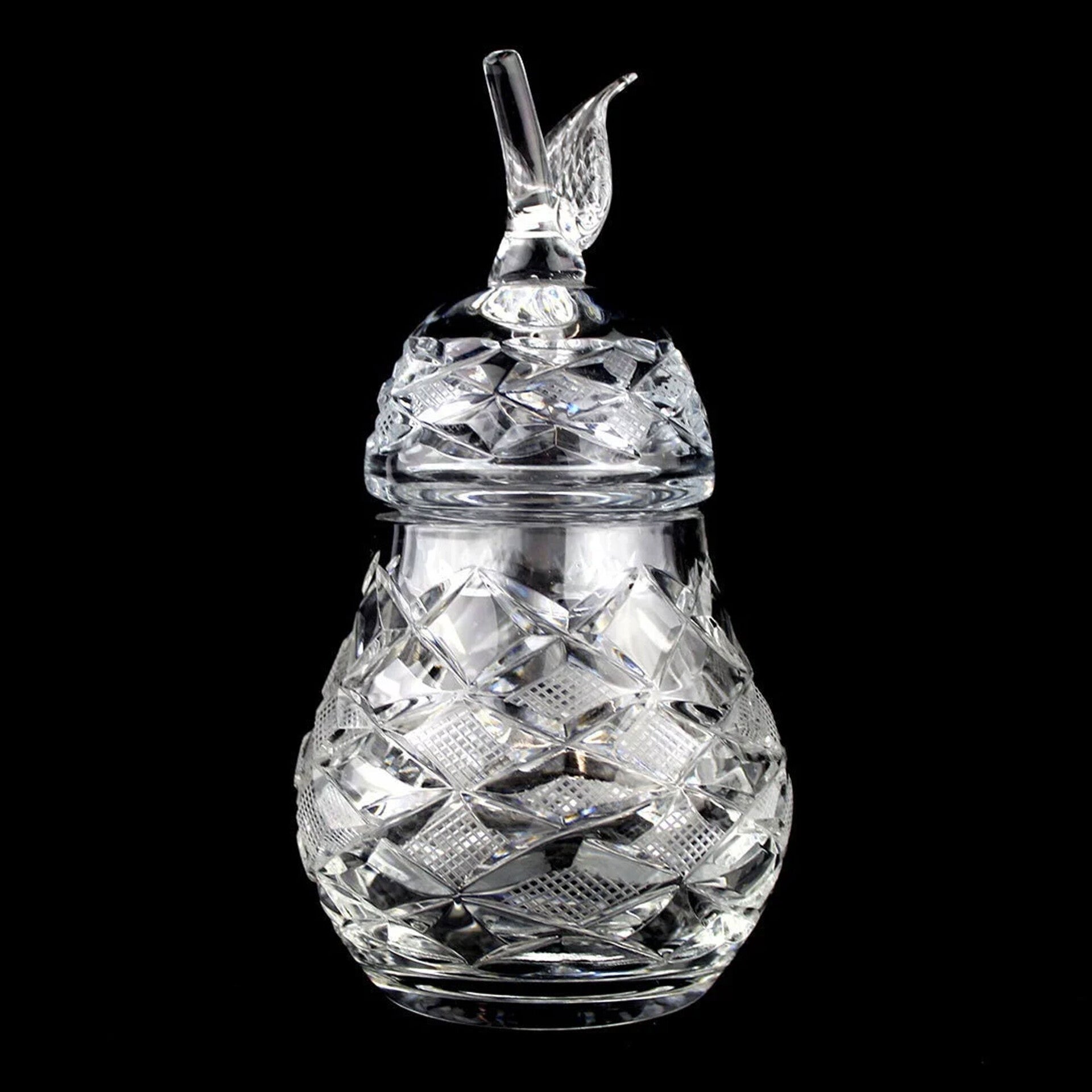 Charmant vintage peertje van prachtig geslepen kristal, bestaande uit twee delen. De losse bovenkant is voorzien van een decoratieve steel met blad, waarmee de deksel eenvoudig kan worden opgetild.