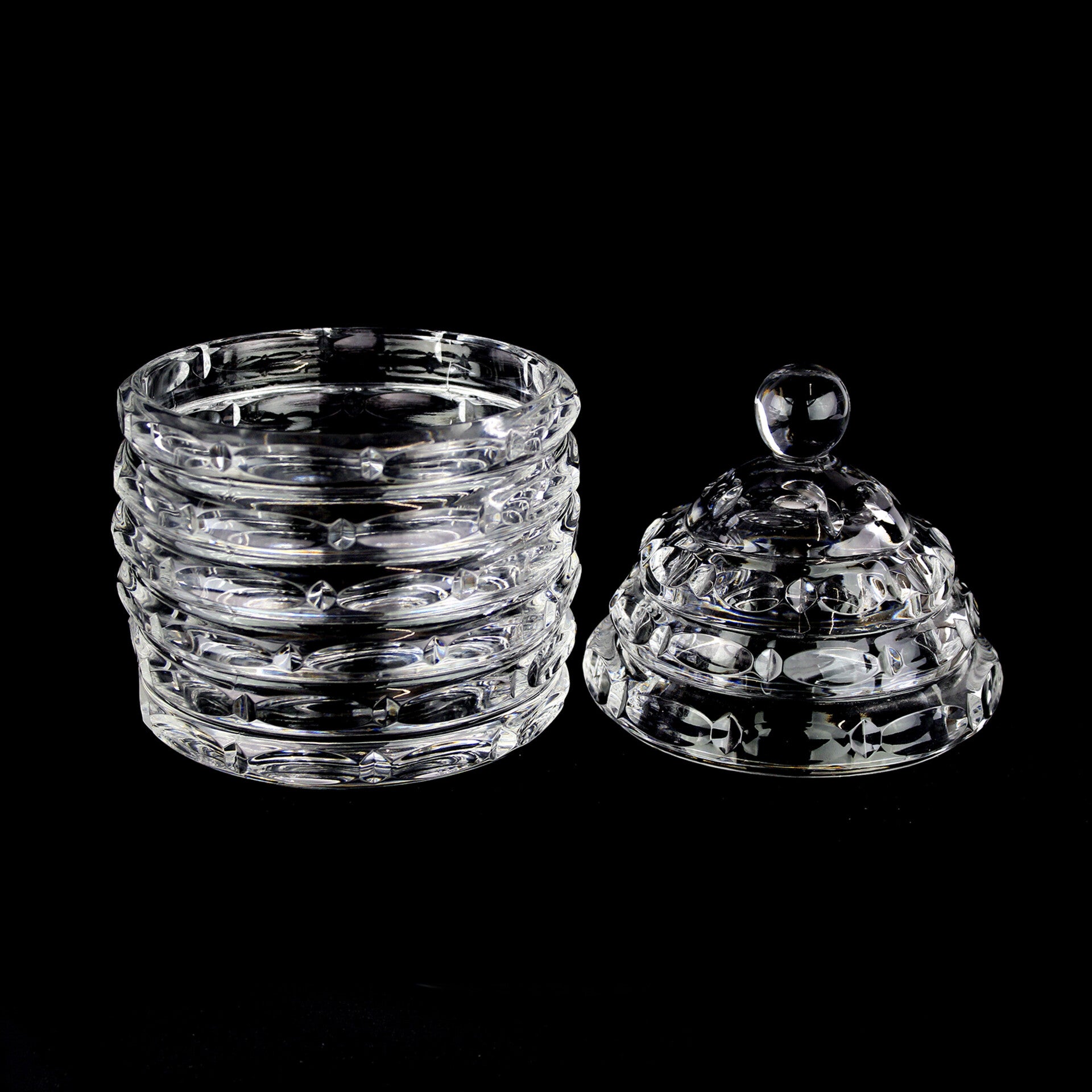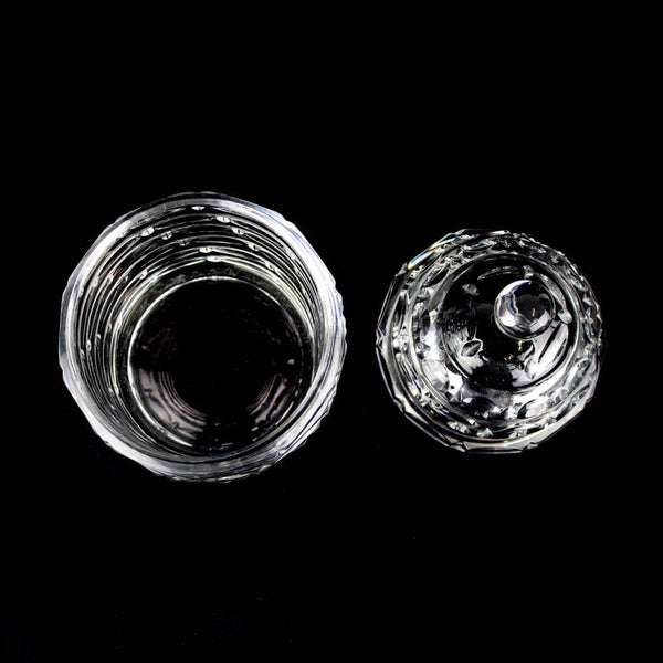 Elegante vintage pot in de vorm van een bijenkorf, vervaardigd uit prachtig geslepen kristal. De pot bestaat uit twee delen en is voorzien van een decoratieve bolknop op de deksel, waarmee je hem eenvoudig opent.