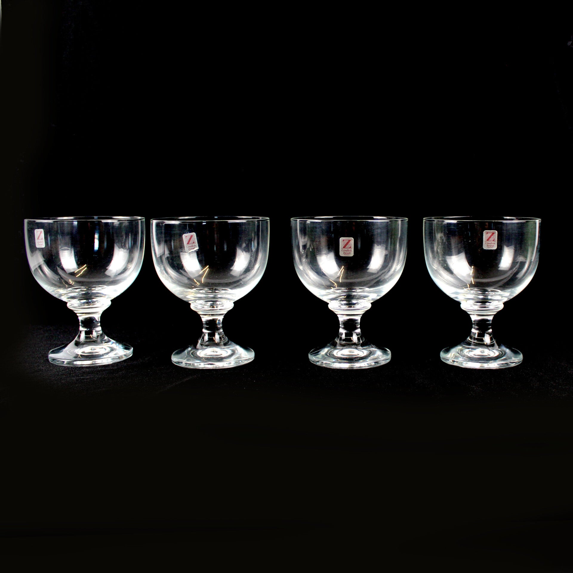 Elegante set van vier kristallen dessertglazen uit het model Sea Isle van het Duitse kwaliteitsmerk Zwiesel. De glazen zijn stijlvol vormgegeven met een voet en ruime kom, perfect voor het serveren van ijs, vers fruit, mousse of andere nagerechten.