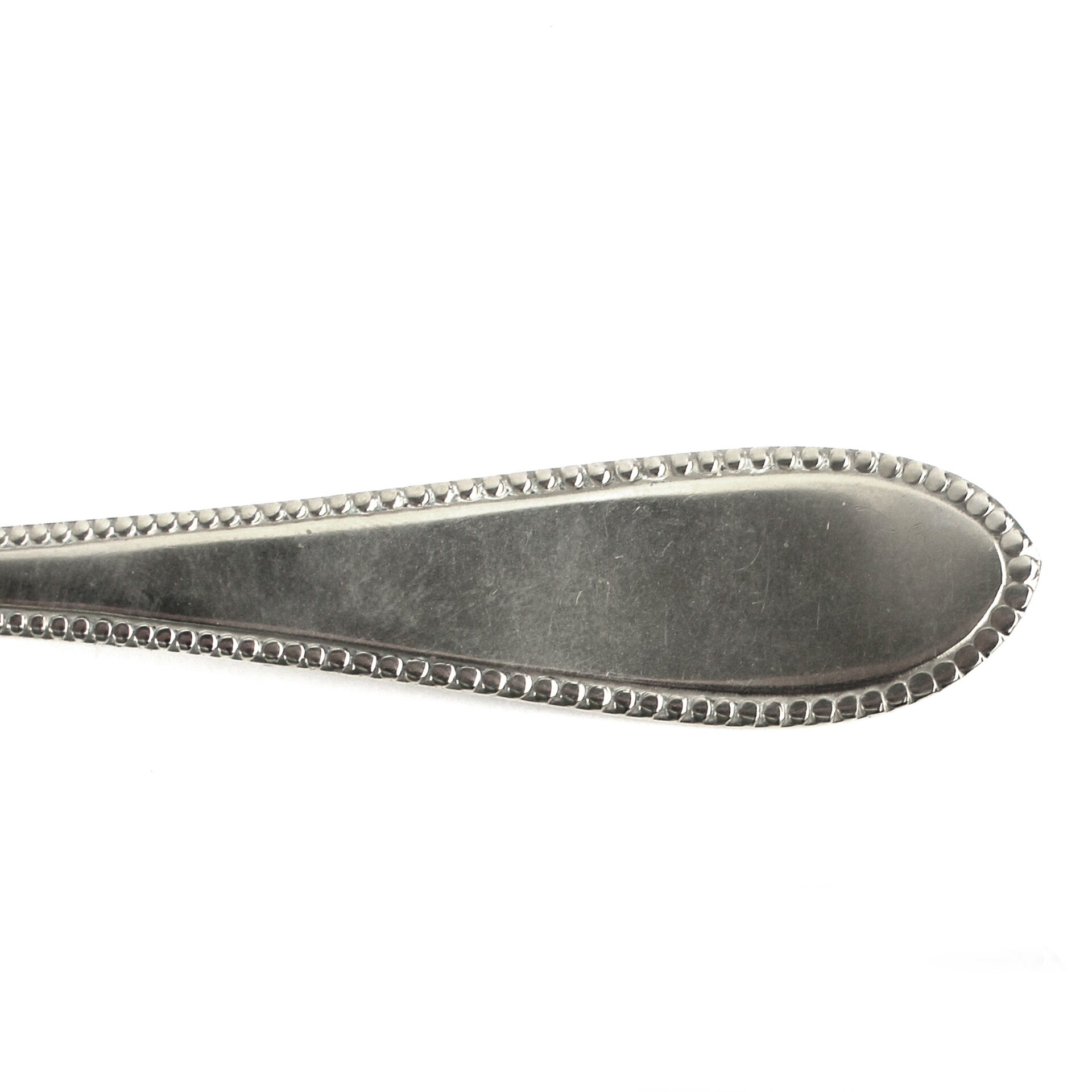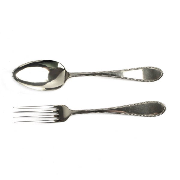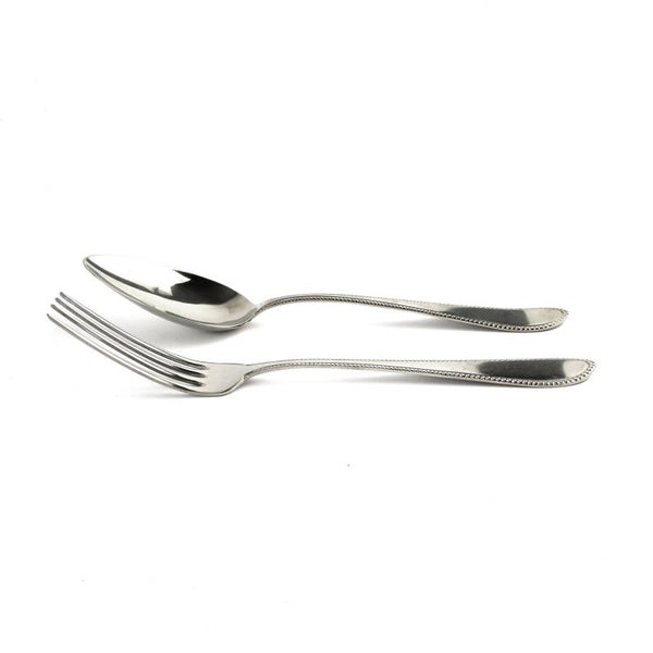 De set bestaat uit zes vorken en zes lepels, elk voorzien van een verfijnde parelrandversiering op het heft, een klassiek en tijdloos ontwerp.