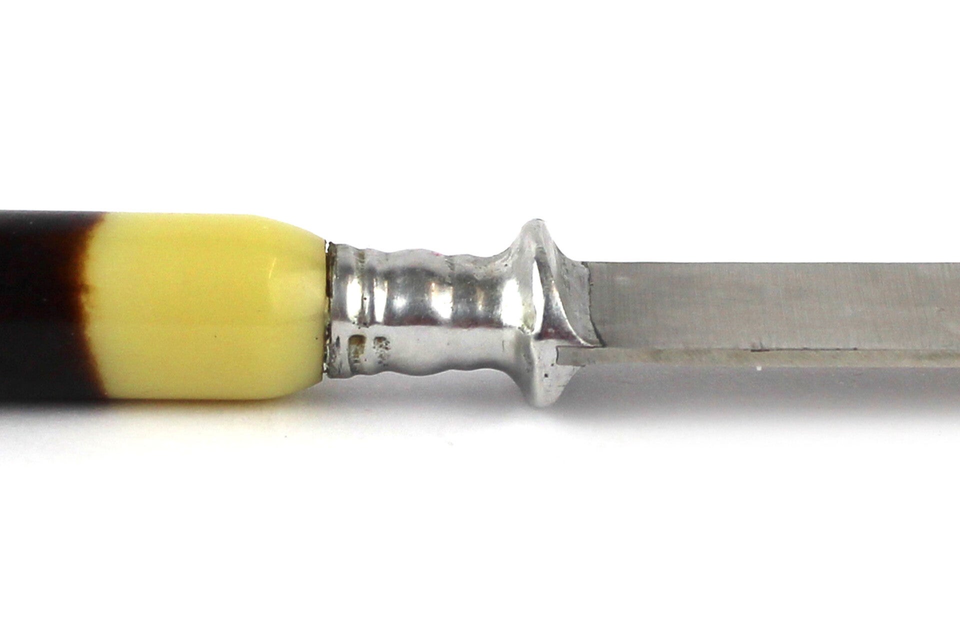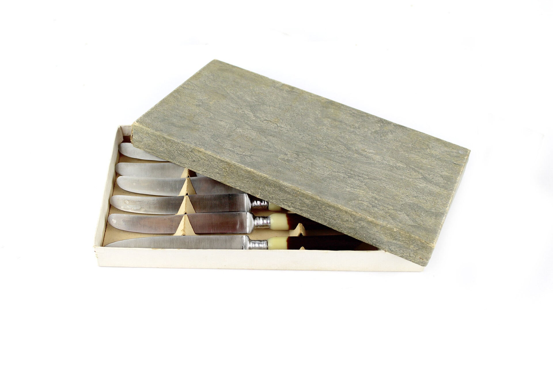 Mooie set van zes vintage roestvrijstalen messen met een handvat van been in de originele verpakking. De messen zijn gemaakt in Nederland door Abenz.