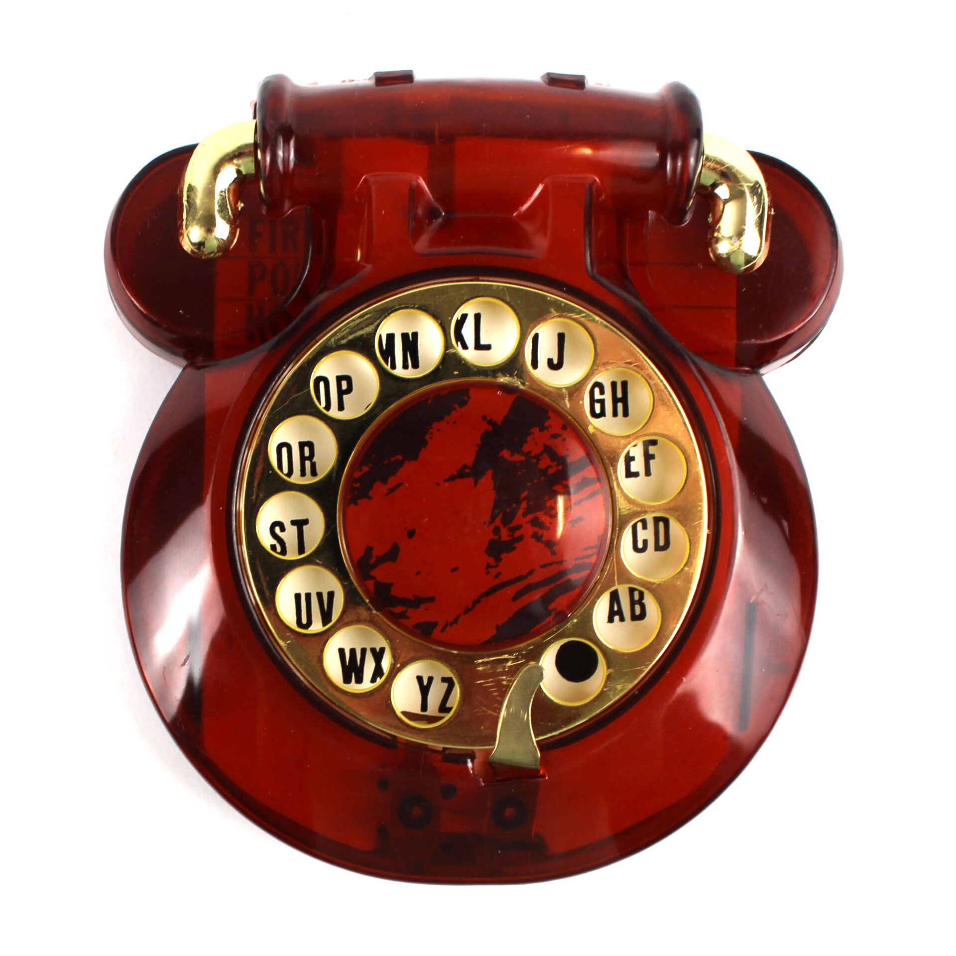 Unieke vintage telefoonklapper in de vorm van een bruin transparante telefoon met goudkleurige accenten. Door het nummer op de draaischijf te draaien, springt de klapper open bij de gekozen letter.