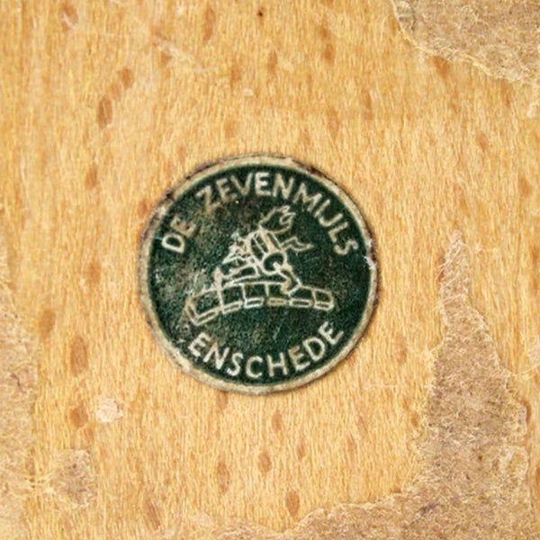 Aan de onderzijde bevindt zich nog de originele sticker van de Zevenmijls tentoonstelling in Enschede (1930) – een bijzonder historisch detail. De vilten laag ontbreekt, maar de boekensteunen zijn nog steeds stabiel en decoratief inzetbaar.