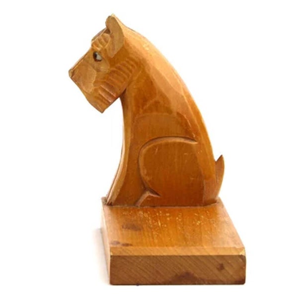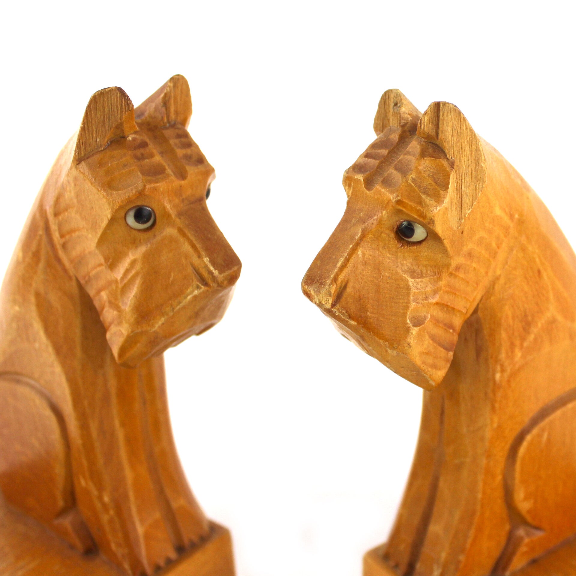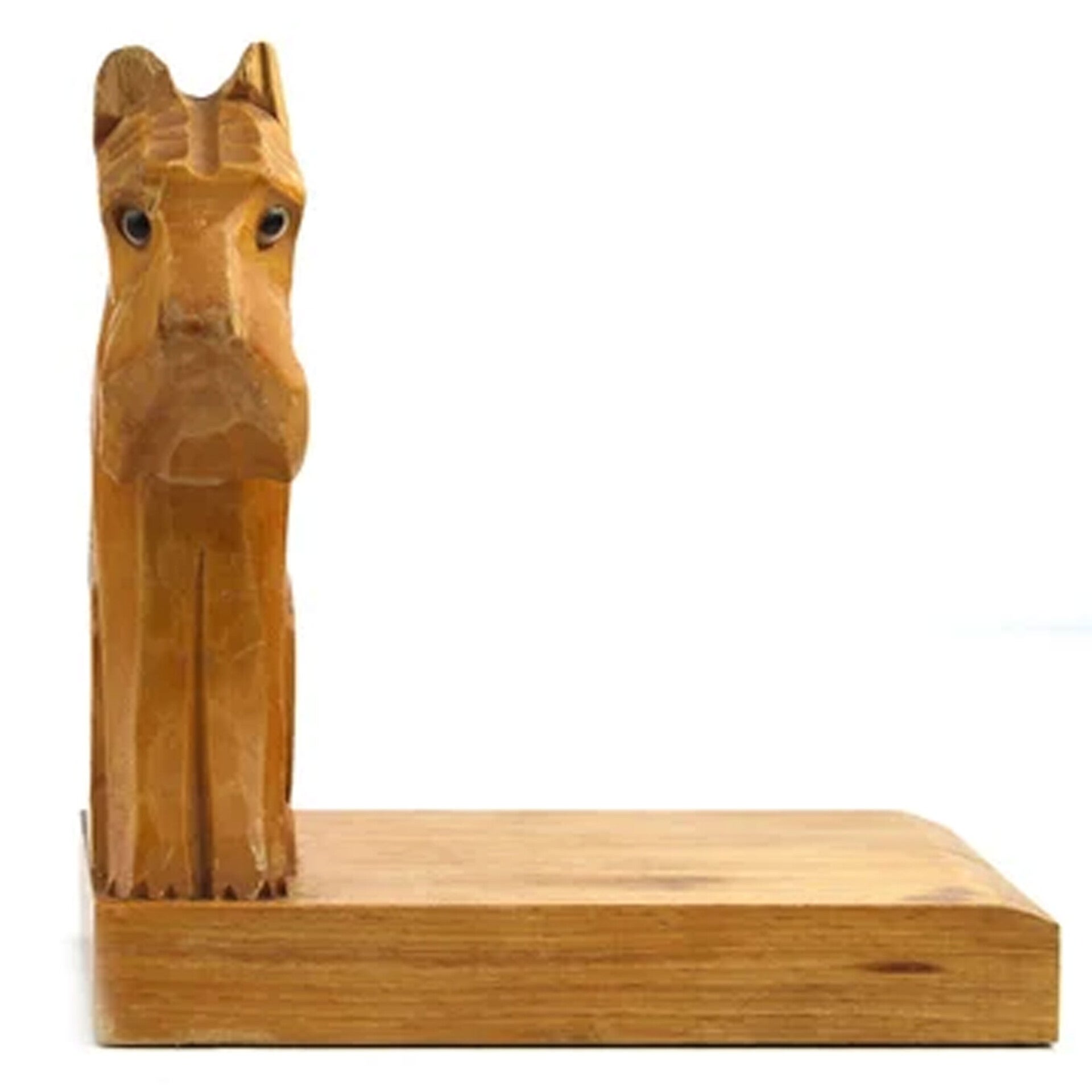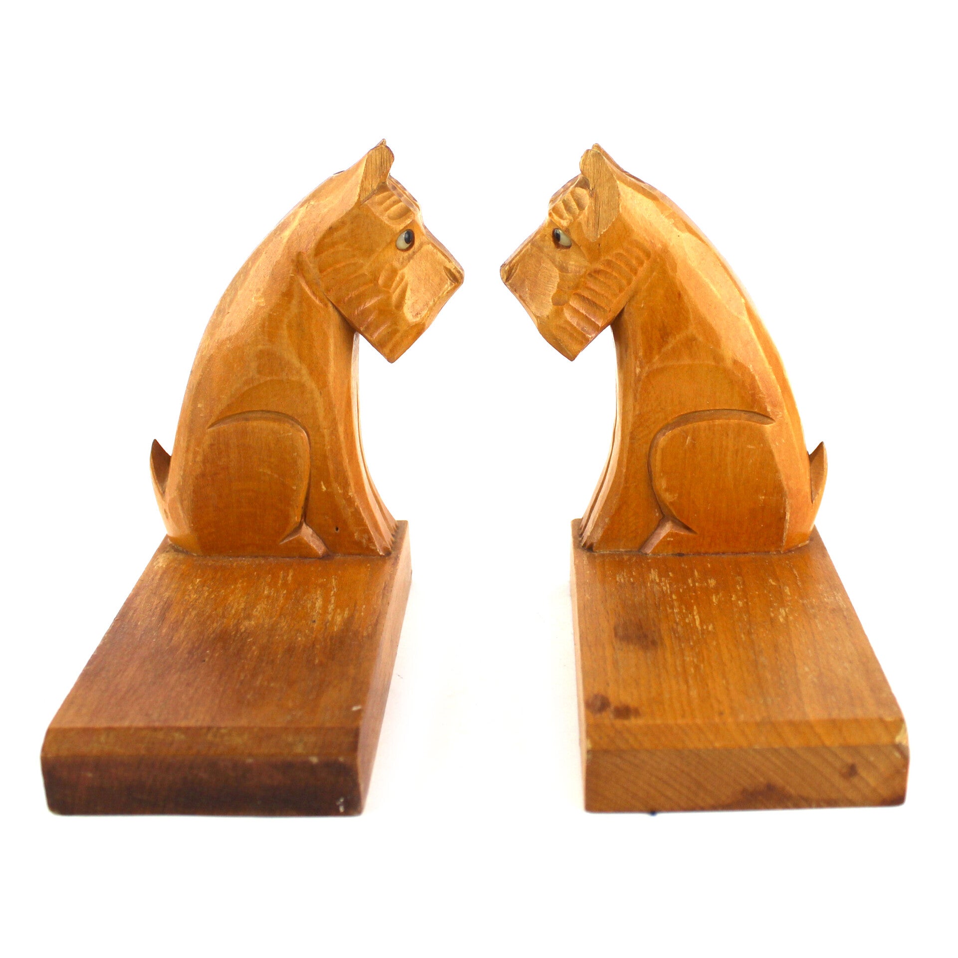 Charmante set van twee vintage boekensteunen uit de jaren 30, met liefde met de hand gesneden uit hout. Elke steun is versierd met een Schotse terriër met glazen oogjes, wat zorgt voor een vriendelijk en levendig karakter.