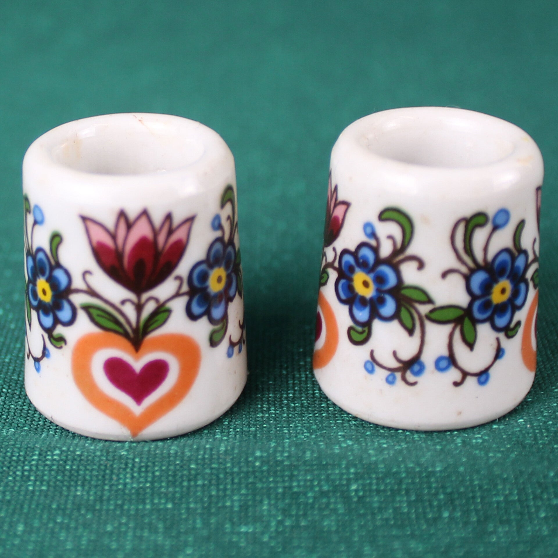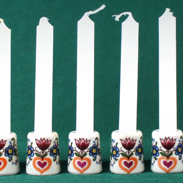 Vintage set van tien vintage mini kandelaars met bloemen en hartjes decoratie, gemaakt door Rösler Exquisit. De set bestaat uit 10 kandelaars met 10 rode kaarsen.