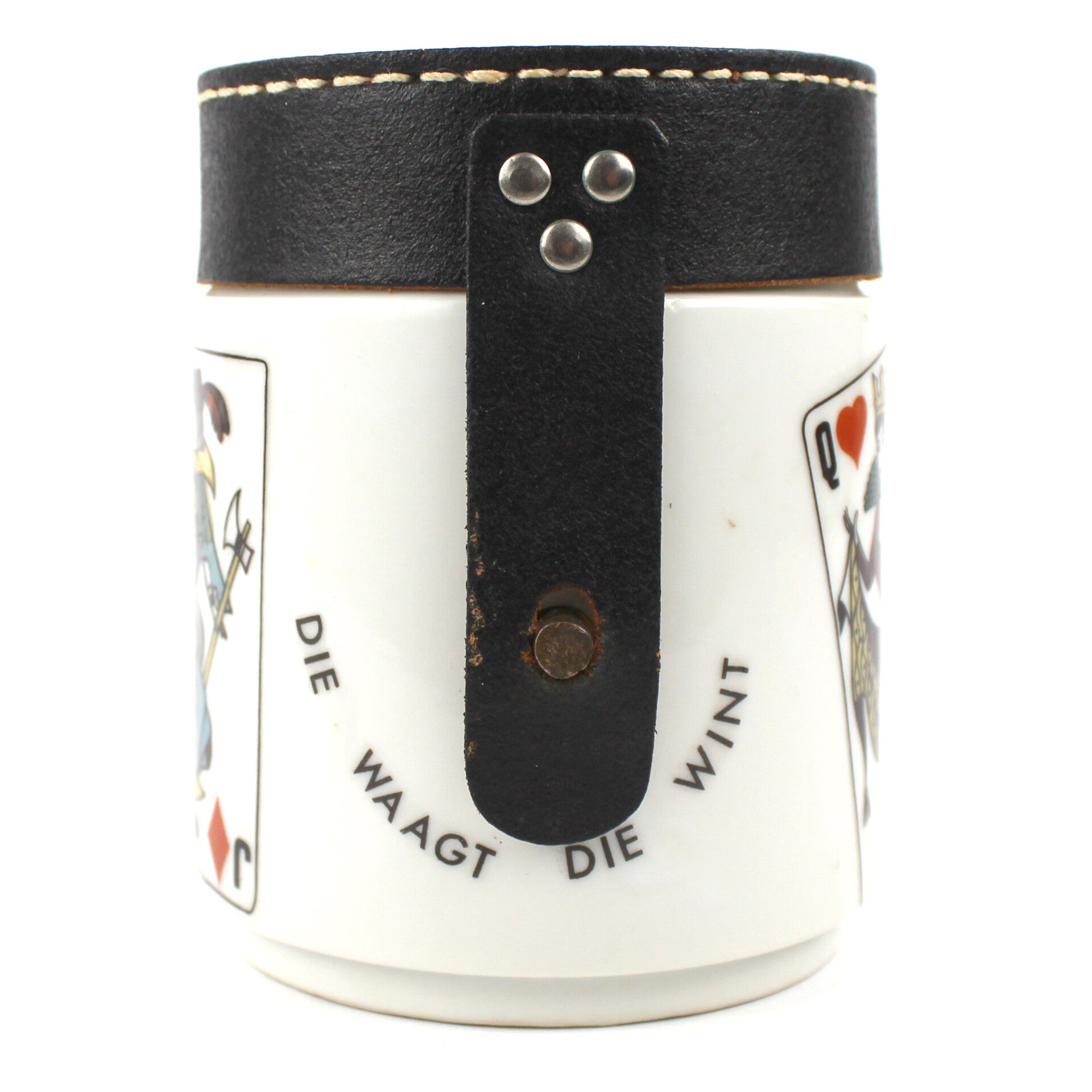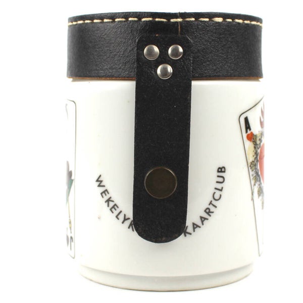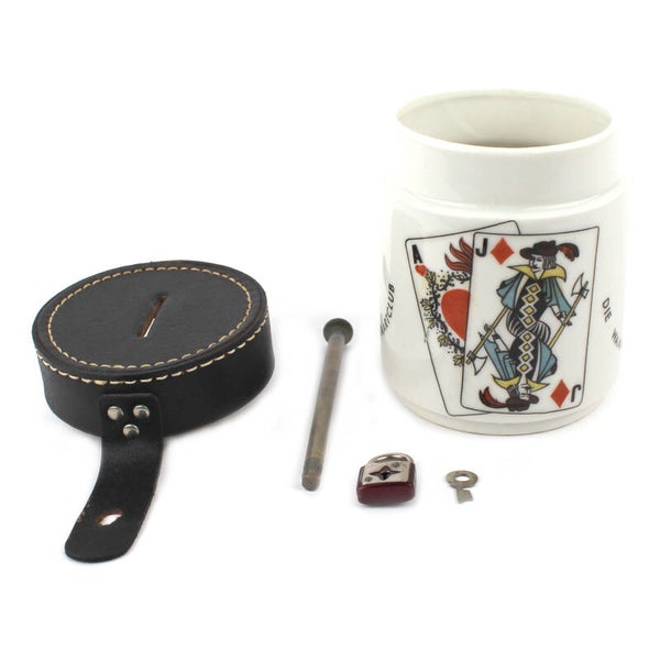 Leuke vintage porseleinen spaarpot met leren deksel, speciaal gemaakt voor de kaartclub. De pot is versierd met speelkaarten en de teksten wekelijkse kaartclub en Wie waagt, die wint. Door het midden van de pot loopt een messing staaf die verbonden is met de deksel, zodat de spaarpot met een slotje kan worden afgesloten.
