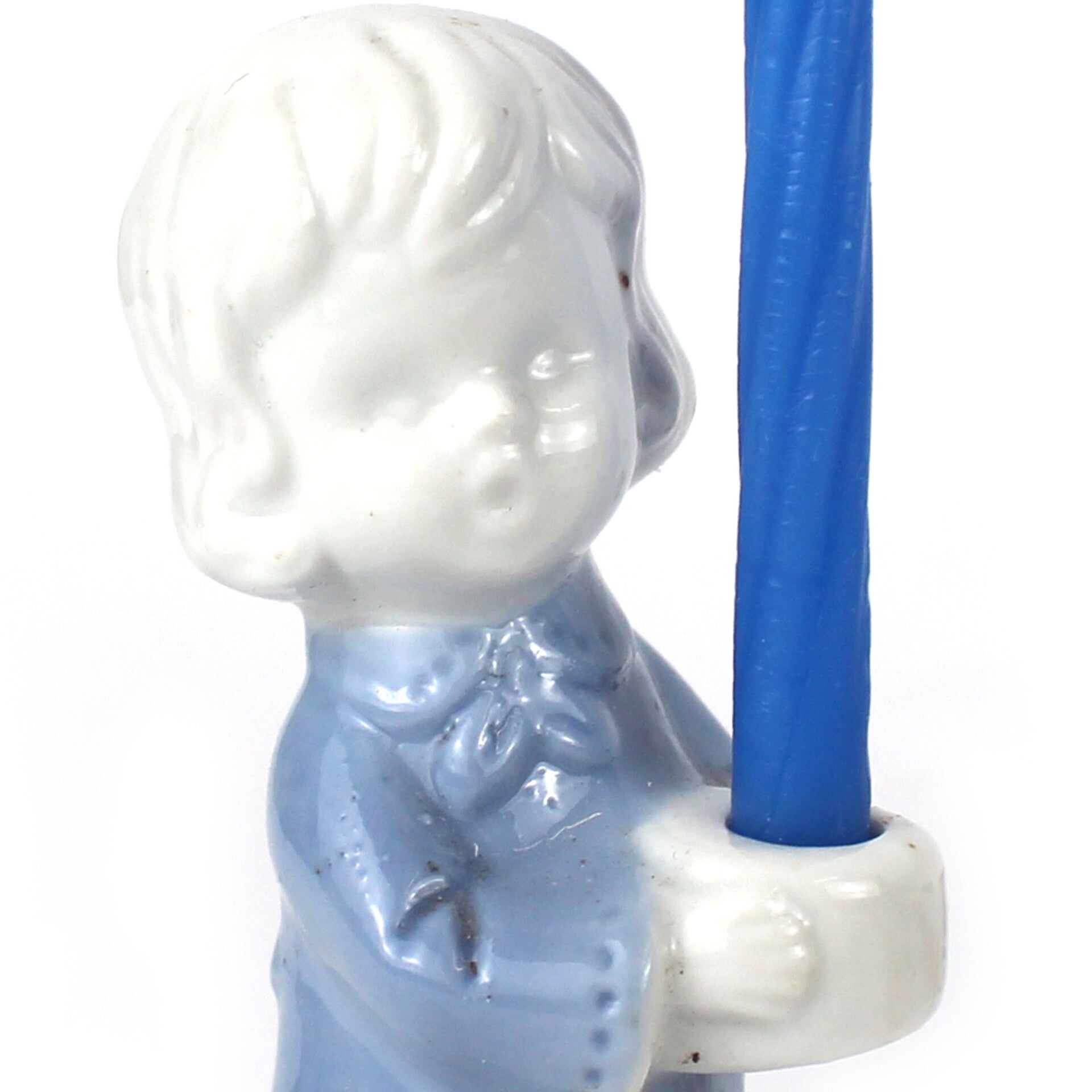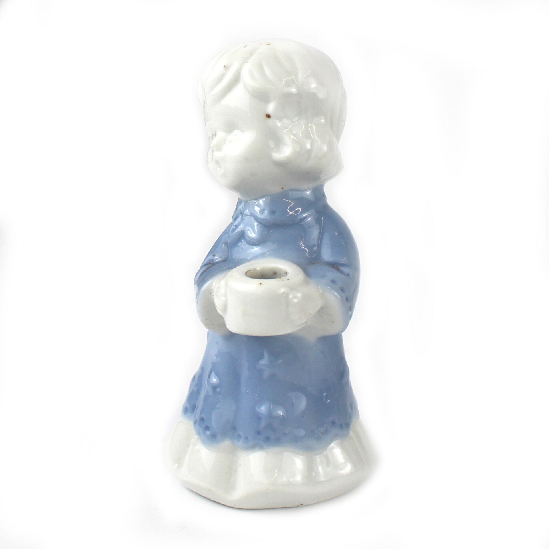 Charmante vintage porseleinen kandelaar uit de jaren 70 in de vorm van een caroling girl. Het zingende meisje draagt een wit gewaad met blauwe glazuuraccenten, zoals bij klassieke choir robes. Voor zich houdt zij een mandje waarin een kaarsje geplaatst kan worden, wat een warm en sfeervol licht geeft tijdens de winter- en kerstperiode.