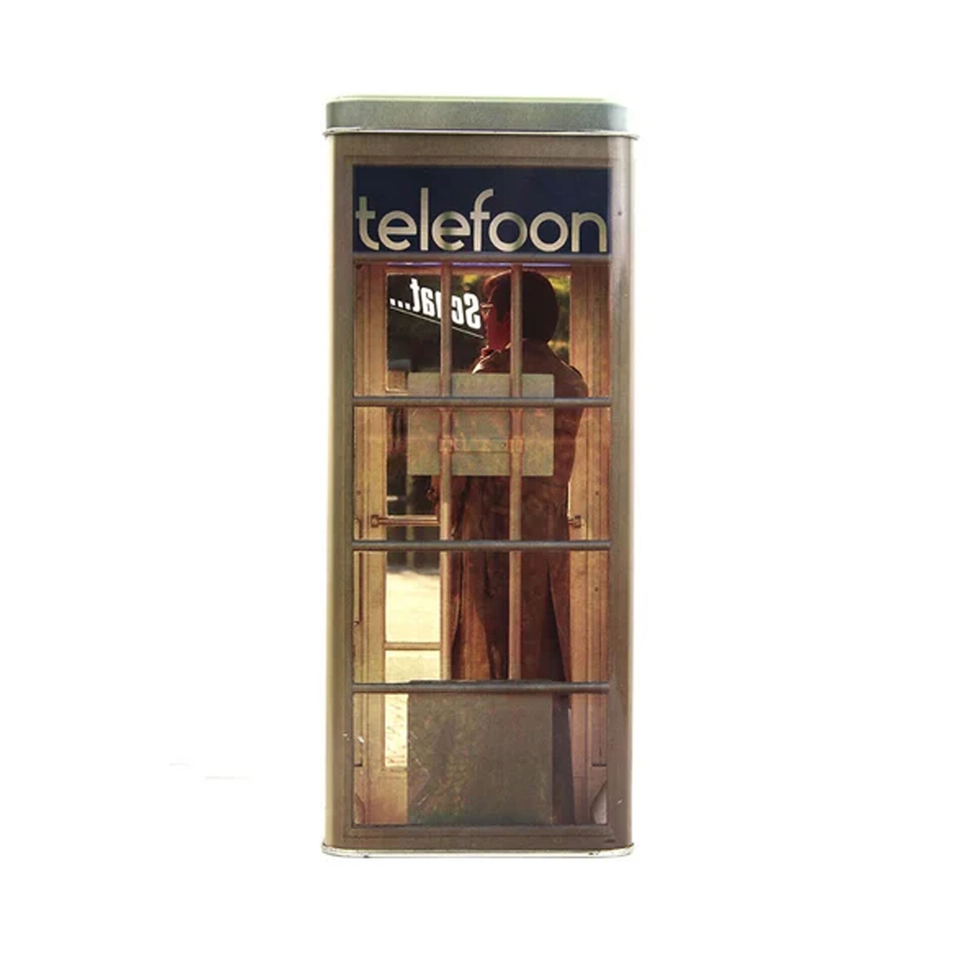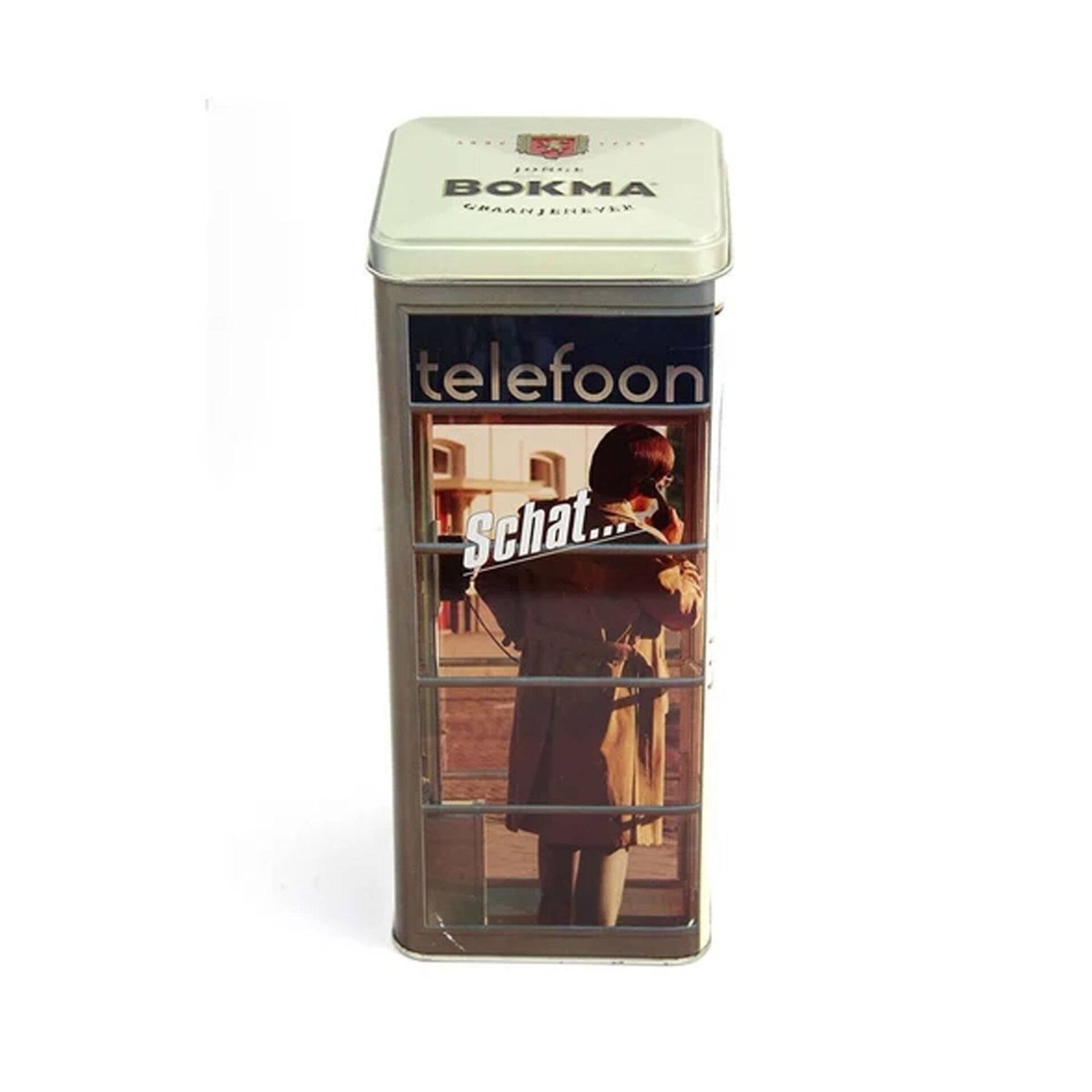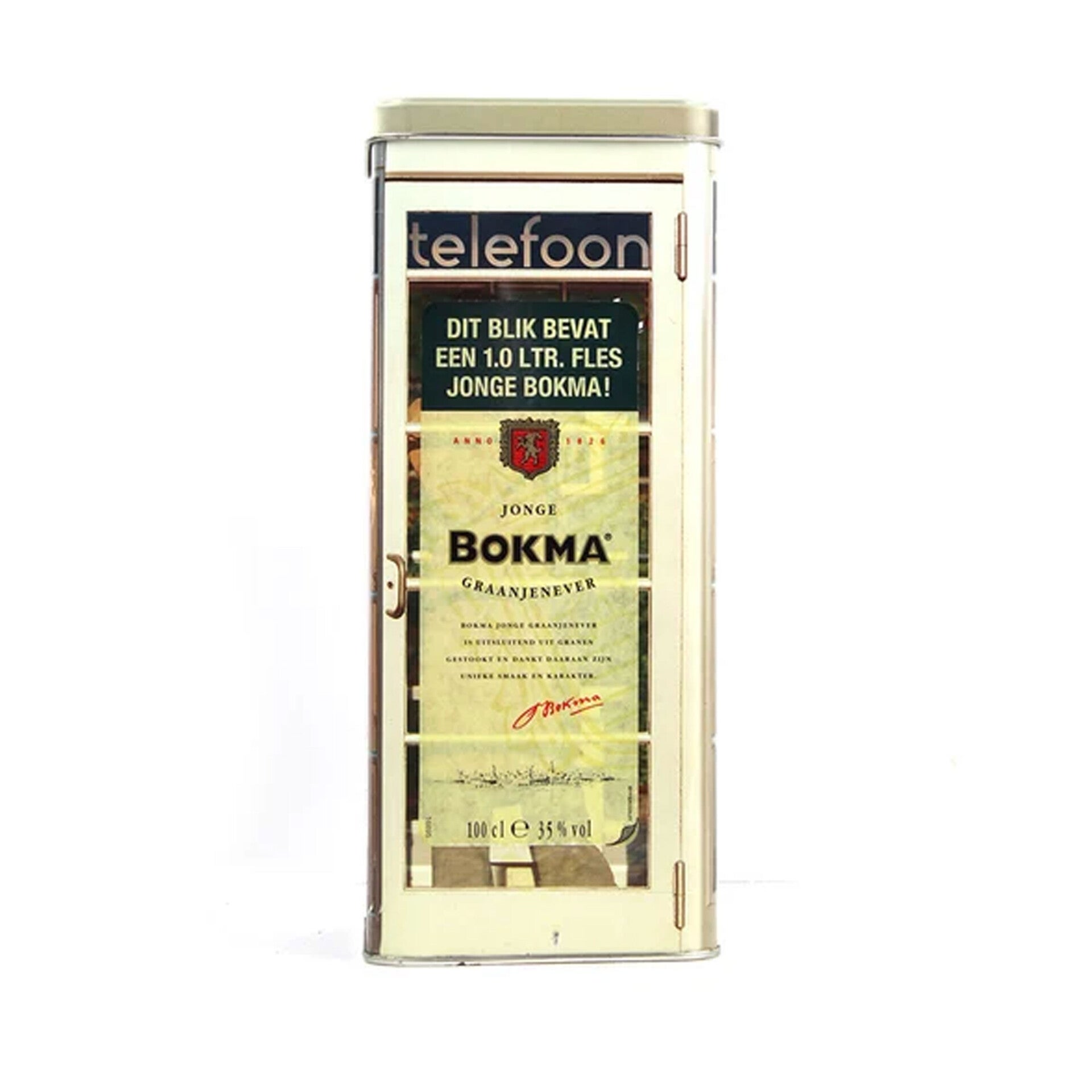 Hoog, rechthoekig blik met los deksel, ontworpen als verpakking voor een fles Bokma Dubbele Graanjenever. Het blik heeft de vorm van een klassieke telefooncel. Binnenin de cel zie je een man die telefoneert met zijn vrouw en “Schat” zegt, een knipoog naar de bekende reclameslogan uit de jaren ’80: “Schat, staat de Bokma koud?”